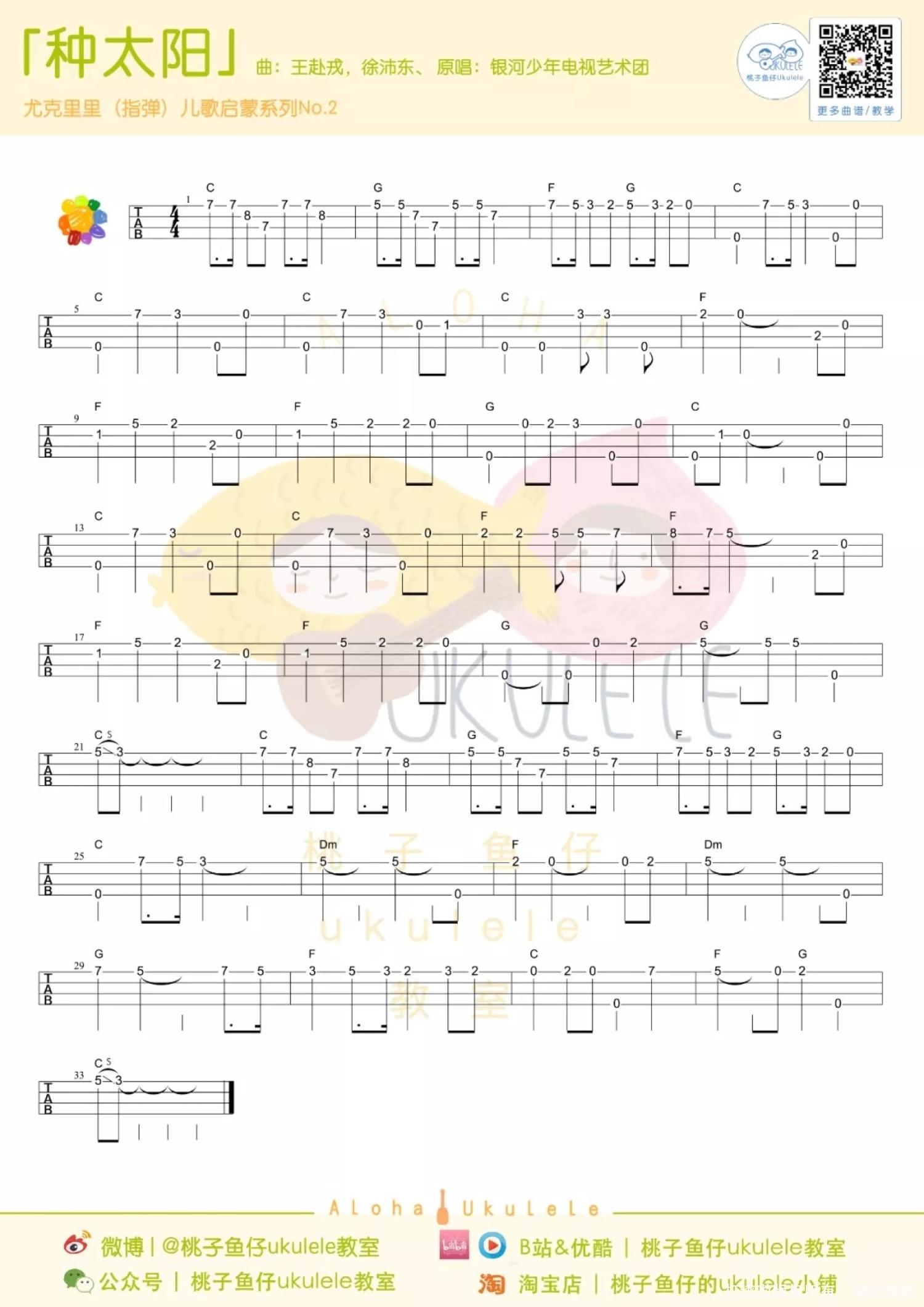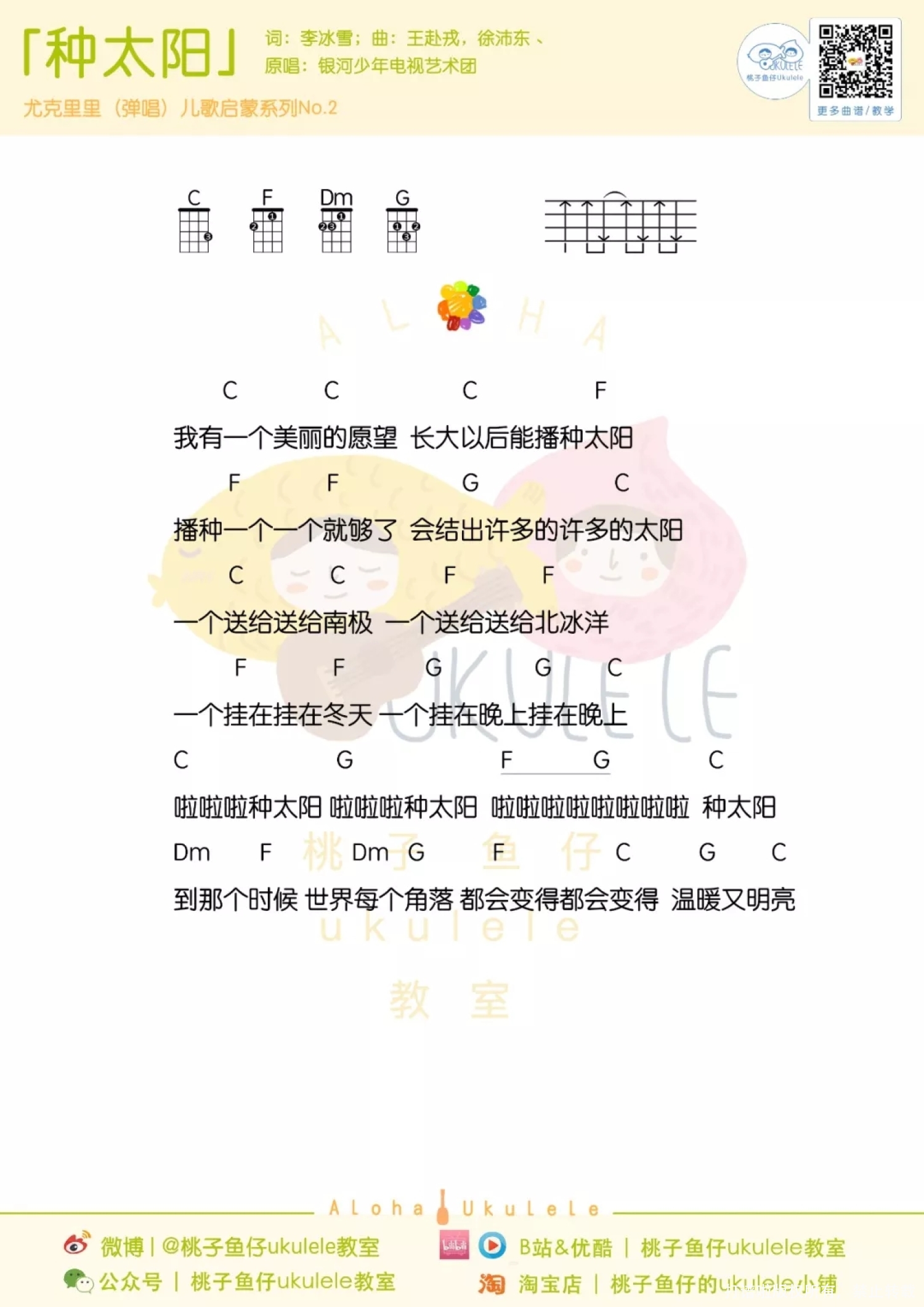曲谱介绍: 种太阳指弹谱 种太阳弹唱谱 目录 ukulele 示范+教学 已经黏糊糊的度过半个月的阴雨季 清晨一打开窗,雨和雾就在你眼前 而太阳,不知道在哪里流浪 (求太阳探完亲赶快回家!) 阴阴阴阴阴阴阴阴阴阴阴阴 雨雨雨雨雨雨雨雨雨雨雨雨 ………… 我们正在发霉中…… 这雨如同办了个无限量套餐 省内任你下 不限流量不加价 春雨细绵绵、清明雨纷纷、 梅雨下不停、夏季暴雨猛! 我想 2019这一波雨, 是没有尽头的…… 我有一个美丽的愿望 长大以后能播种太阳 播种一个,一个就够了 会结出许多的许多的太阳 (大家这是“种太阳”的节奏?) 一直下雨,小朋友都不能尽情出去玩耍了啦! 唐僧老师为全国阴雨季准备了 这首饱含希望和温暖的儿歌 —《种太阳》 除了超可爱的示范视频,还暖心录制了教学哦 拿起你手中的尤克里里弹起来 用温暖治愈的歌声把太阳召唤回来   种太阳指弹谱   种太阳弹唱谱