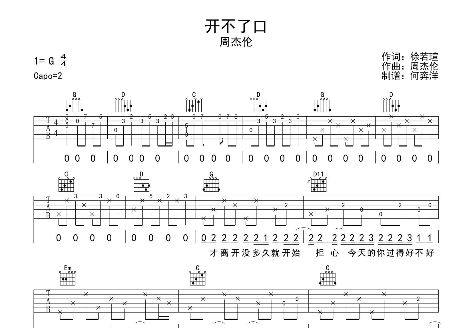 曲谱介绍: 由何奔洋制谱的《开不了口》吉他谱【附音频】,周杰伦演唱,选用G调和弦指法,建议变调夹夹二品弹唱,《开不了口》吉他六线谱,共两张PNG高清图片谱,节奏4/4拍,含前奏75%接近原版,难度初级简单。 吉他弹唱预览音频: