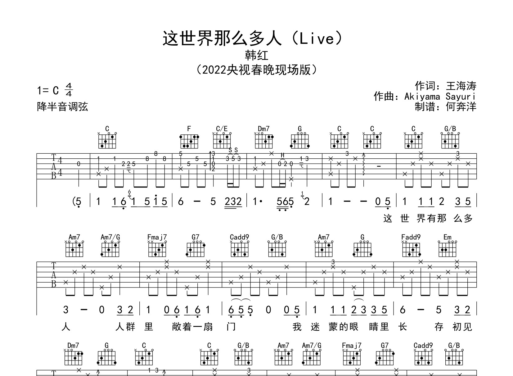 曲谱介绍: 韩红《这世界那么多人》吉他谱,2022春晚现场版,由何奔洋制谱,选用C调指法编配,《这世界那么多人》吉他弹唱谱,共两张高清图片谱,节奏4/4拍,弹唱难度较简单。 吉他弹唱预览音频: