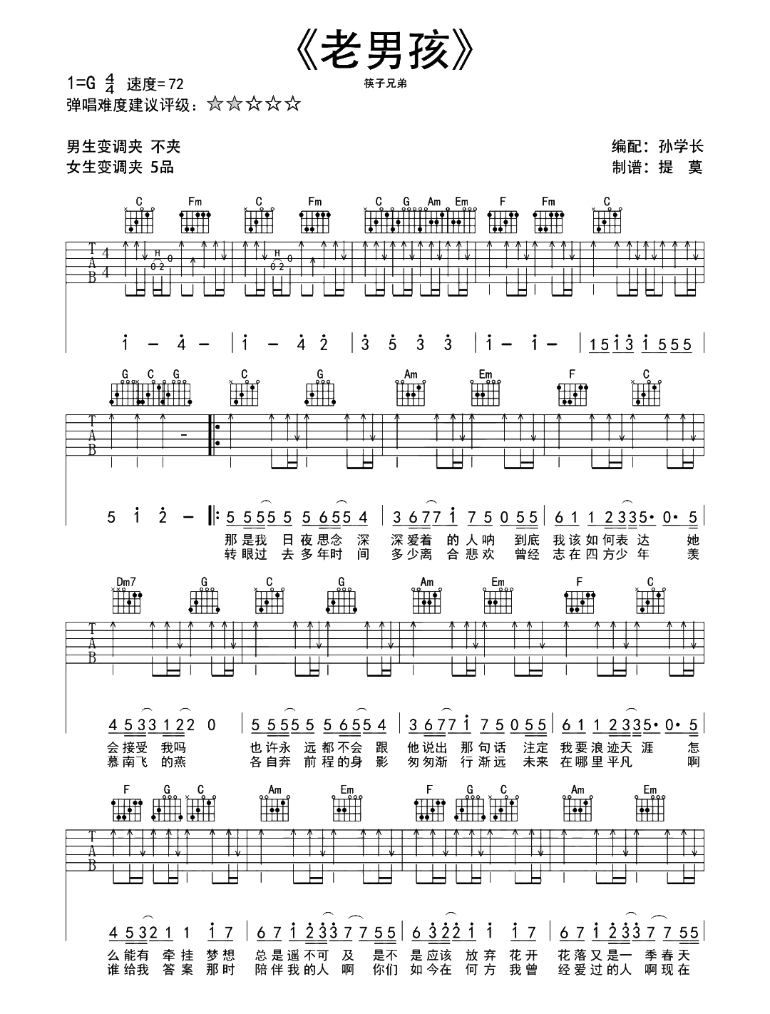 曲谱介绍: 由孙学长编配的《老男孩》吉他谱【原版演示】,G调指法不用变调夹,《老男孩》弹唱六线谱,男生不用变调夹,女生可夹5品处弹唱,速度72拍每分钟,节奏4/4拍,难度简单,随谱附有《老男孩》原版的前奏演示视频,也是这首歌许多人容易出错的地方,建议大家参考。 吉他弹唱预览视频: 您的浏览器不支持。
