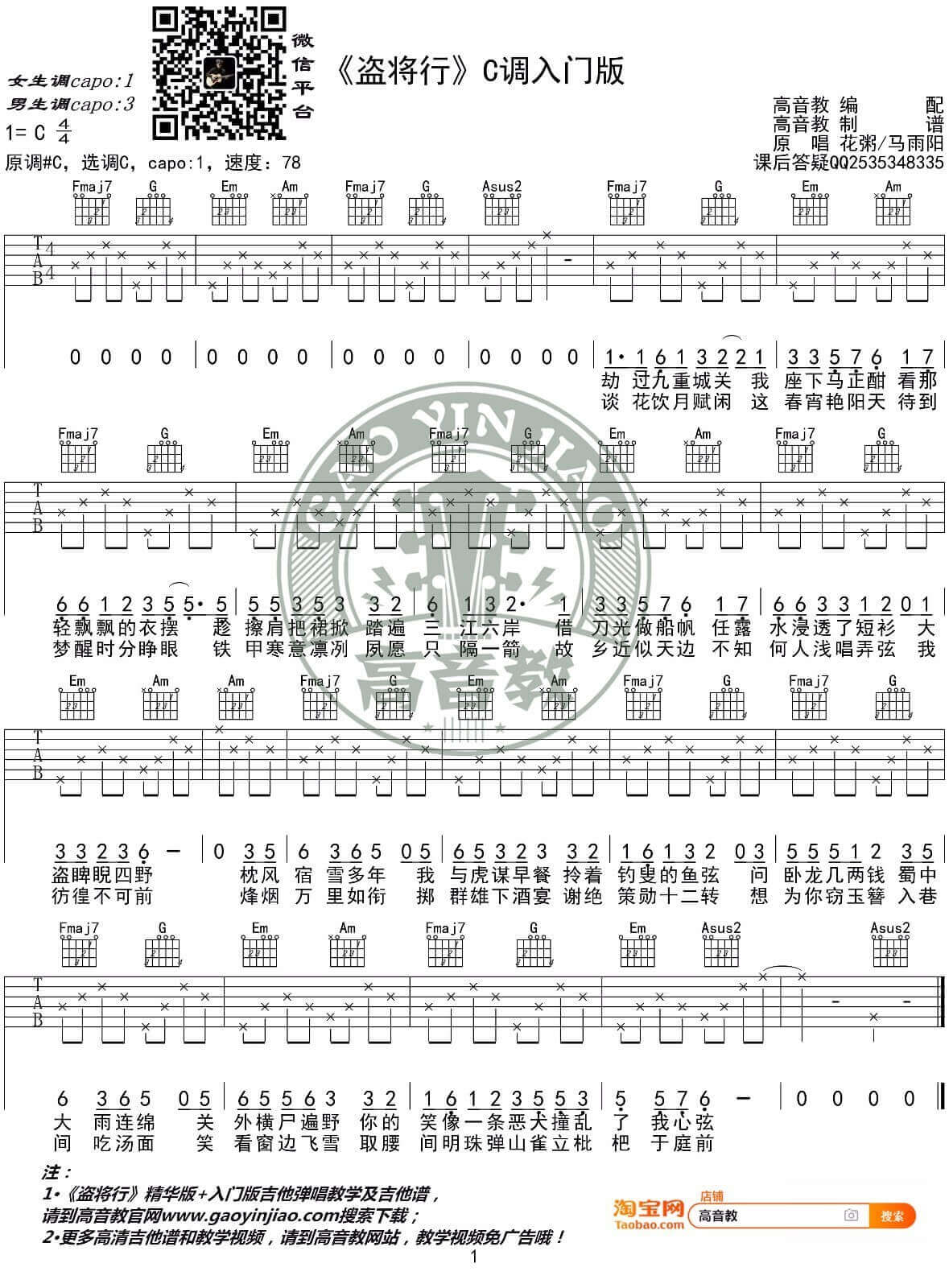 曲谱介绍: 吉他经常给我很多的满足。要想得到吉他给你带来的好处,你就必须付出努力。 花粥/马雨阳《盗将行》C调入门简单版弹唱吉他谱_高清图片谱分享,来自民谣女歌手花粥和马雨阳合作的作品《盗将行》,一首非常有意思的古风歌曲,此版本的曲谱是由高音教团队编配,采用C调指法,适合吉他入门的琴友用来练习之用,男生建议变调夹3品,女生1品。 花粥/马雨阳《盗将行》C调入门简单版弹唱吉他谱_高清图片谱: