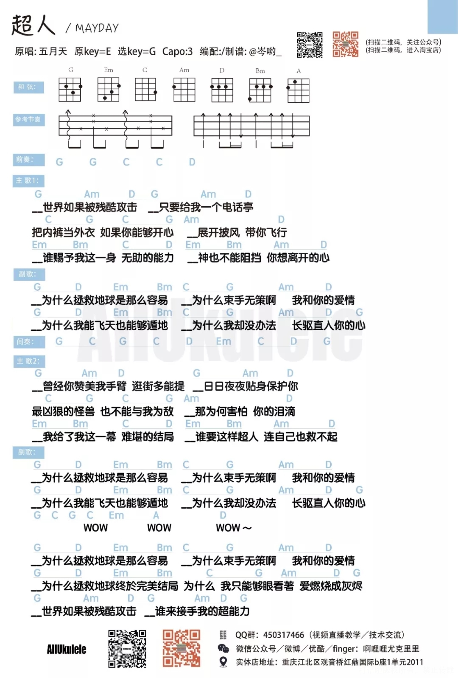 曲谱介绍: 「超人」尤克里里弹唱谱 “我想 成为你的 超人。” 不知道喜欢五月天的小可爱们有没有发现这首歌,确实是宝藏歌曲,不管大家有没有听过,都戳上面的音频听岑哟弹唱的一小段吧~ 这首歌第一次听的时候感觉并不惊艳,可是越听越好听。 然后就忍不住扒了这首歌,如果大家喜欢,我再出一个完整的弹唱视频和教学视频。 还有啊~大家要把自己照顾得像超人一样,当自己的超人...不然...人真的是病来如山倒...很久没有更公众号了,小可爱们很抱歉! 现在我们就一起来了解以下五月天的这首——《超人》 听完超人听米老鼠,听完米老鼠听超人,不许告诉别人这两首歌,因为不希望这么好听的歌烂大街,嘘