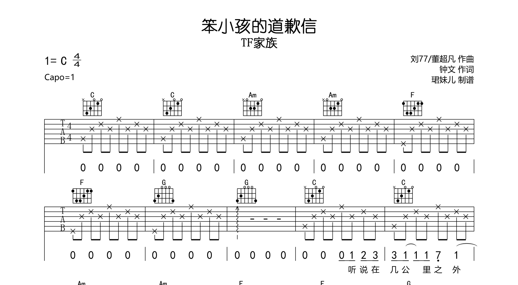 笨小孩的道歉信吉他谱 - TF家族 - C调吉他弹唱谱