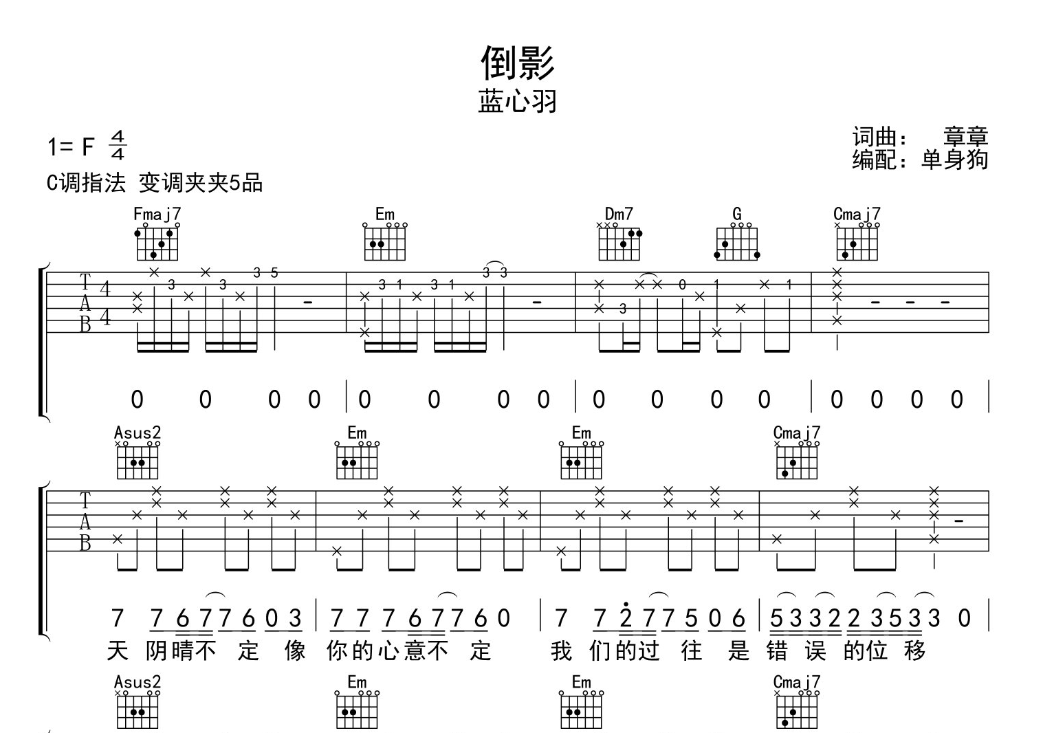 曲谱介绍: 蓝心羽《倒影》吉他谱,由单身狗制谱,C调指法,变调夹夹5品,《倒影》弹唱六线谱,共两张高清图片谱,节奏4/4拍,弹唱难度初级简单。