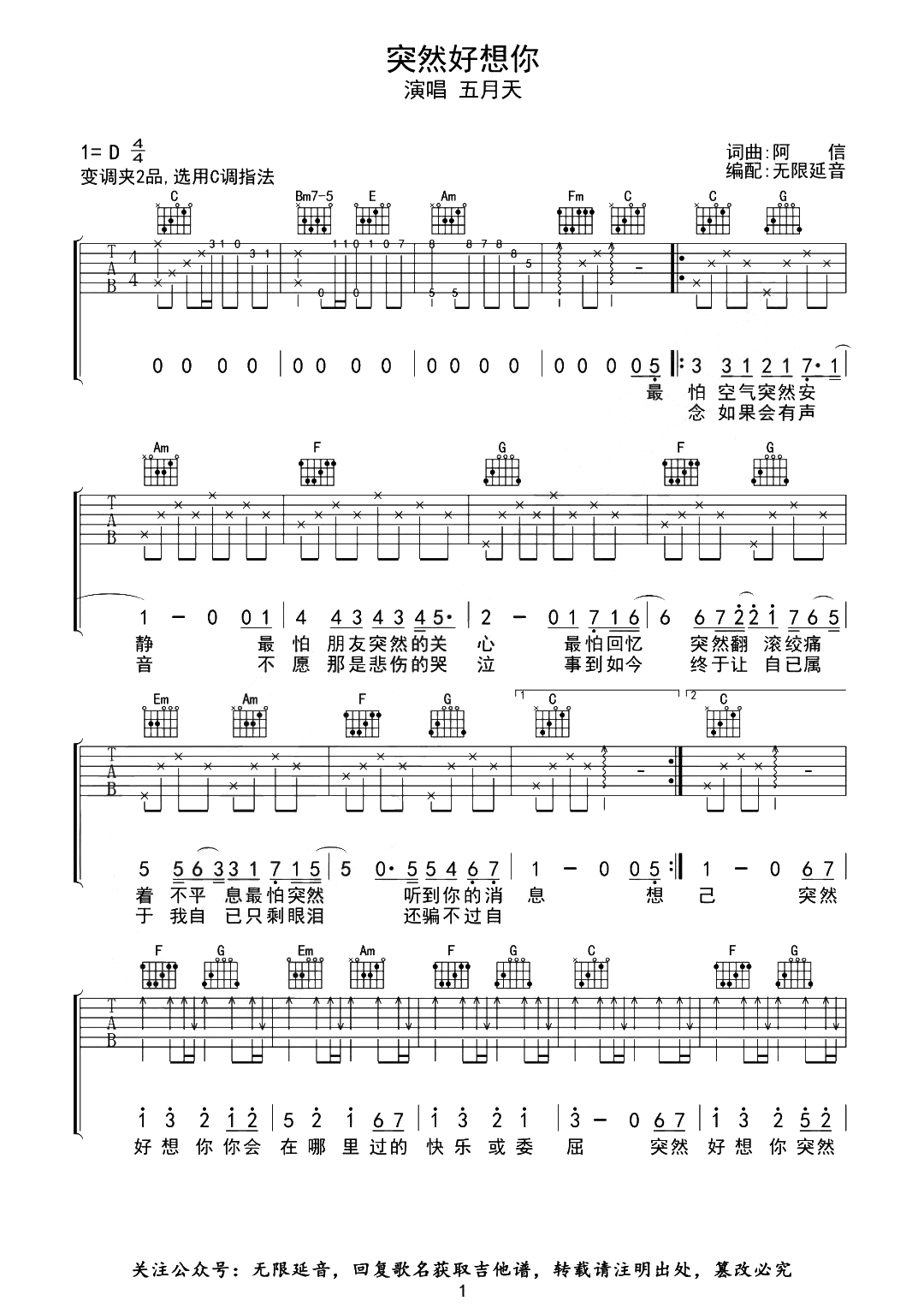 突然好想你吉他谱 - 五月天 - C调吉他弹唱谱 - 原版