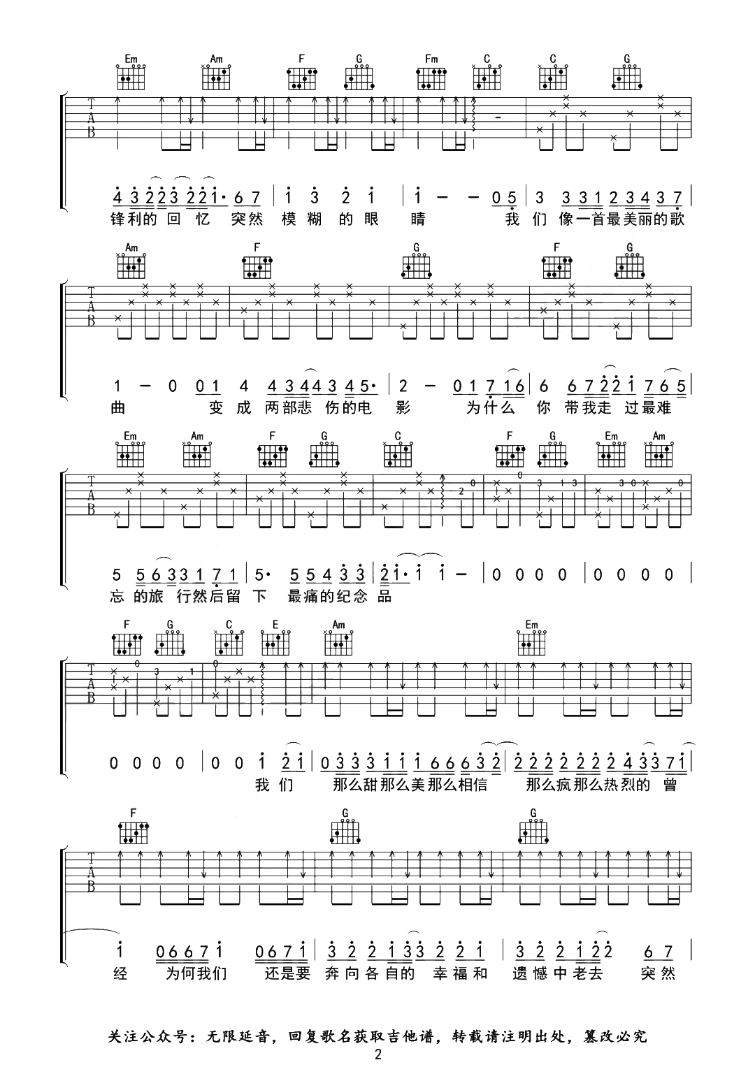 曲谱介绍: 由无限延音制谱的《突然好想你》吉他谱,五月天演唱,C调指法编配,变调夹2品弹唱,《突然好想你》吉他六线谱,共有三张图片谱,节奏4/4拍,简易原版编配含改良前奏,难度初级简单。 吉他弹唱预览视频: 您的浏览器不支持。