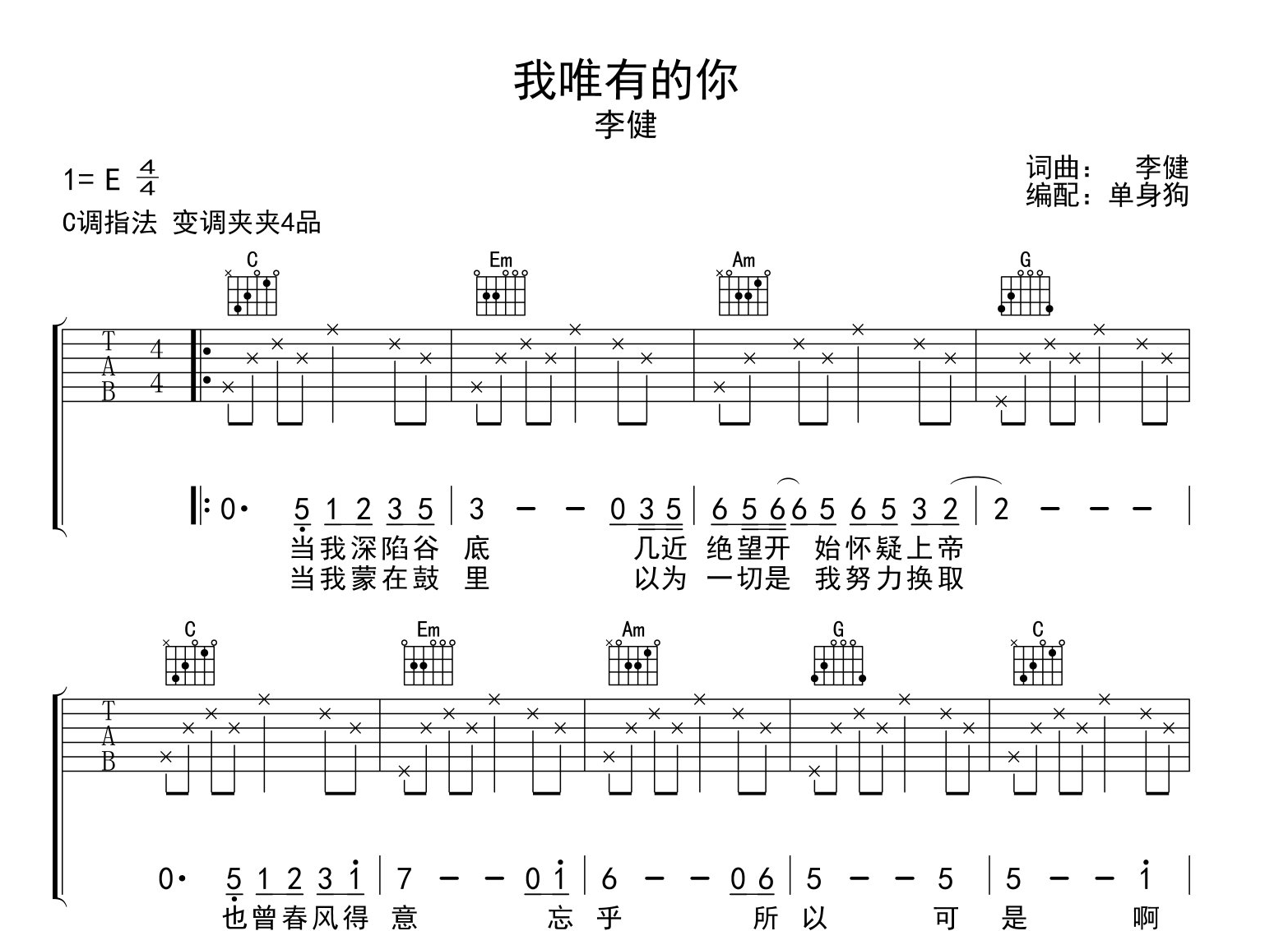 曲谱介绍: 李健《我唯有的你》吉他谱,由创作者单身狗制谱,C调编配,变调夹4品,《我唯有的你》吉他弹唱谱,共两张高清图片谱,节奏4/4拍,弹唱难度初级简单。