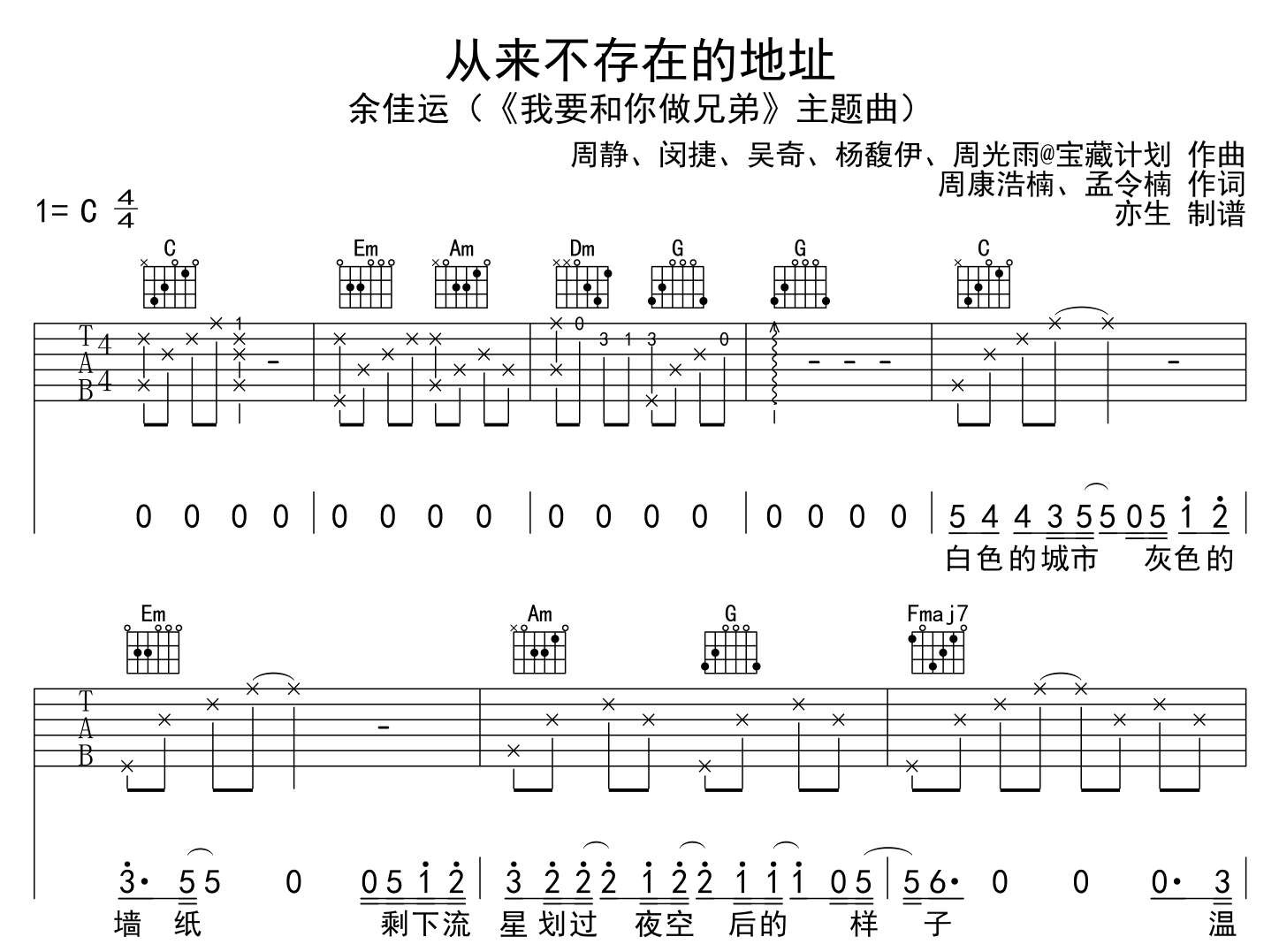 曲谱介绍: 由创作者亦生制谱的《从来不存在的地址》吉他谱,余佳运演唱,C调和弦指法编配,《从来不存在的地址》弹唱六线谱,共三张高清图片谱例,节奏为4/4拍,速度为95拍每分钟,建议不夹变调夹进行弹唱,难度简单。