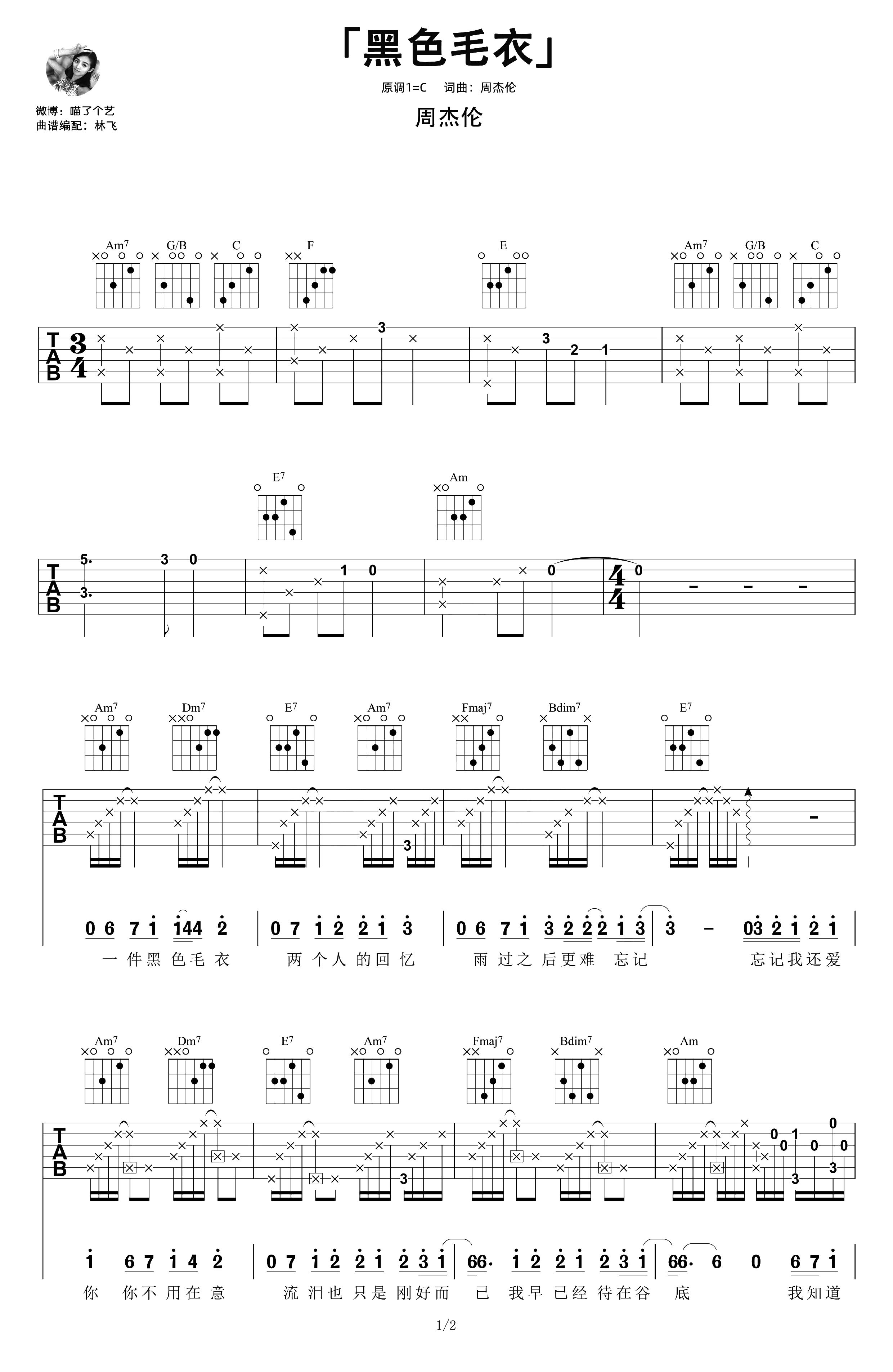 曲谱介绍: 由喵了个艺制谱的《黑色毛衣》吉他谱【附演示/教学】,周杰伦演唱,C调指法编配,《黑色毛衣》吉他六线谱,共两张高清图片谱,节奏3/4拍,随谱的《黑色毛衣》弹唱演示视频为女生版,夹2品弹唱,具体根据自己嗓音调整。 《黑色毛衣》吉他演示视频 《黑色毛衣》吉他教学视频