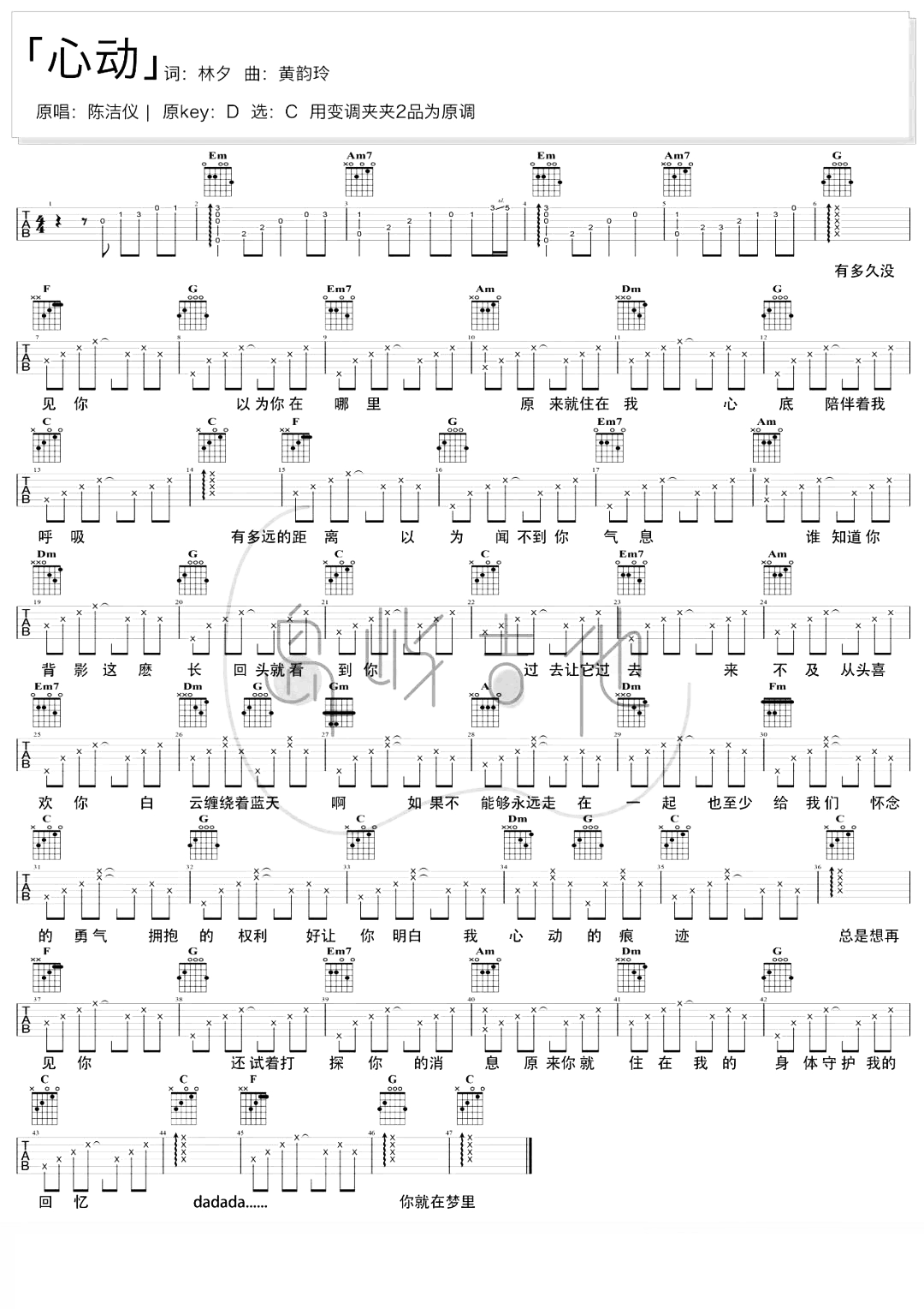 曲谱介绍: 心动吉他谱,陈洁仪演唱,选用C调,原调D调,变调夹2品弹唱,《心动》吉他六线谱,共1张高清图片谱,包含前奏版本完整,弹唱难度初级简单,随谱附《心动》吉他演示+教学视频,大家可进行参考。 《心动》吉他弹唱演示视频 《心动》吉他弹唱教学视频