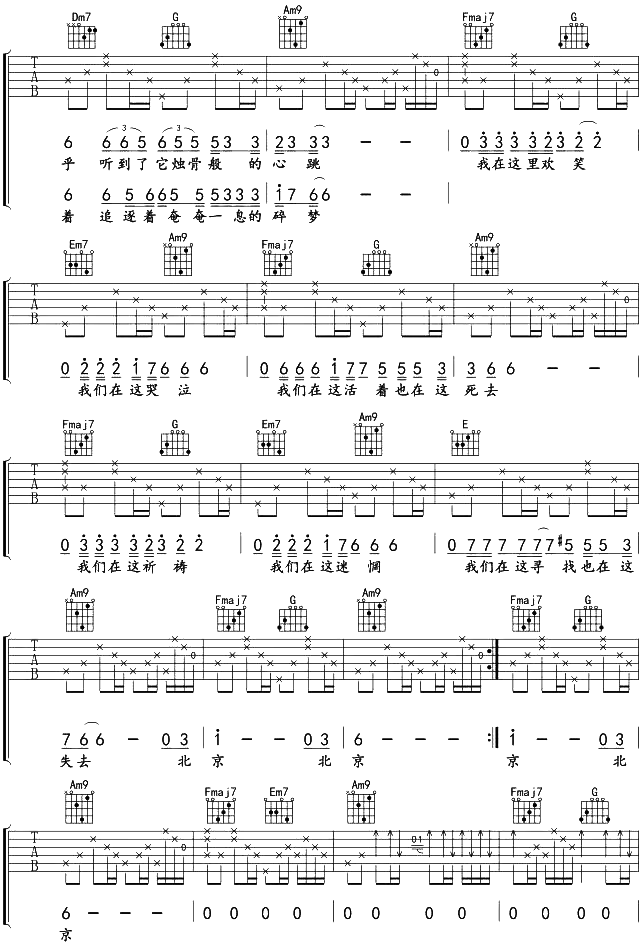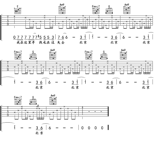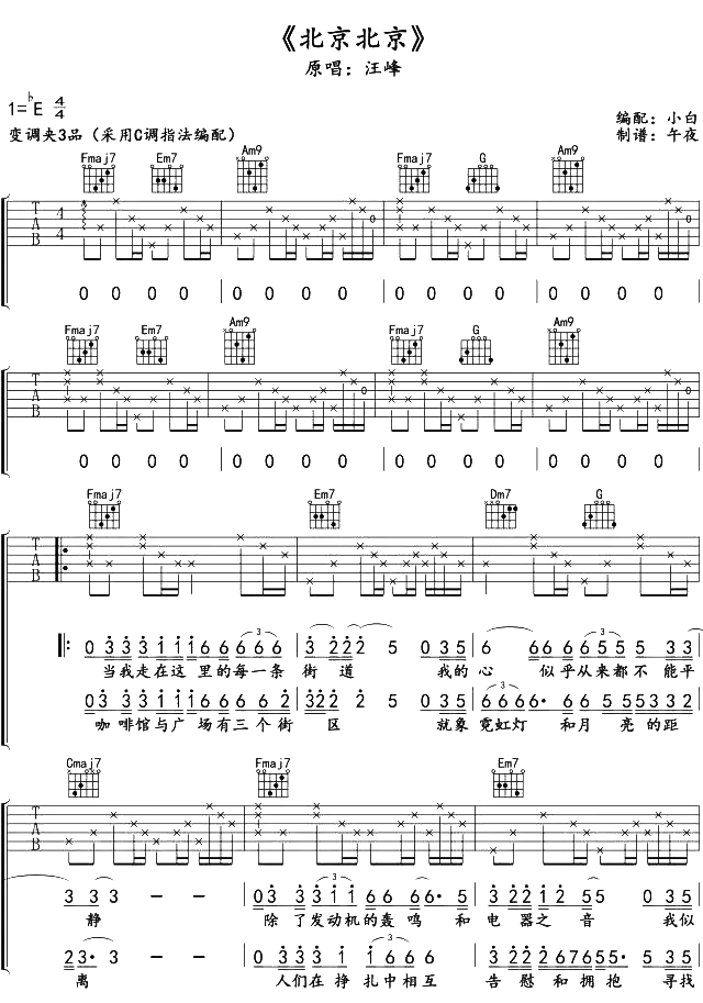 曲谱介绍: 汪峰《北京北京》吉他谱,由午夜制谱,C调指法编配,《北京北京》吉他弹唱谱,共4张高清图片谱例,节奏4/4拍,包含完整前奏,75%接近原版,弹唱难度初级简单,男生变调夹可夹3品弹唱原调bE。