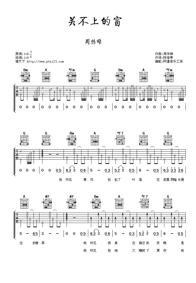曲谱介绍: 由阿潘音乐工场制谱的《关不上的窗》吉他谱,周传雄演唱,选用D调指法,《关不上的窗》吉他弹唱谱,共两张高清图片谱例,节奏3/4拍,可不用变调夹弹唱原调D调,难度初级。