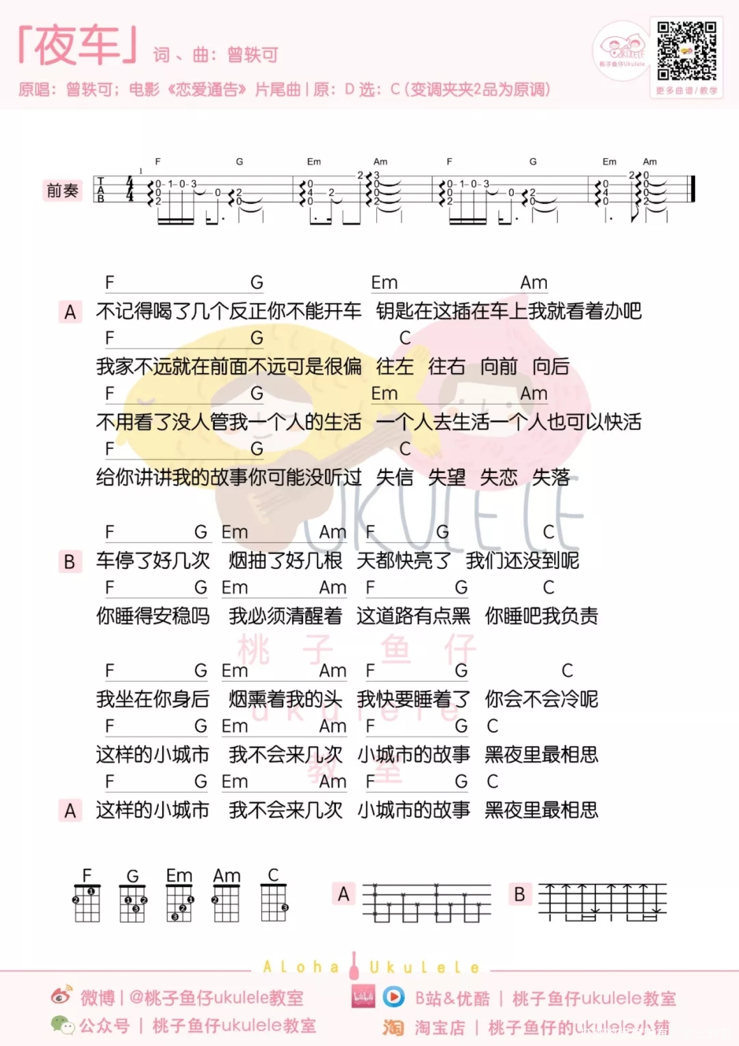 曲谱介绍: 呀~又要推送小绵羊的歌曲啦 小清新+小文艺+小可爱+小慵懒 = 曾轶可 昨晚小编睡觉前 还在单曲循环《有可能的夜晚》 今天要和大家分享的《夜车》 这首歌也一直在我的歌单里   「夜车」尤克里里弹唱谱