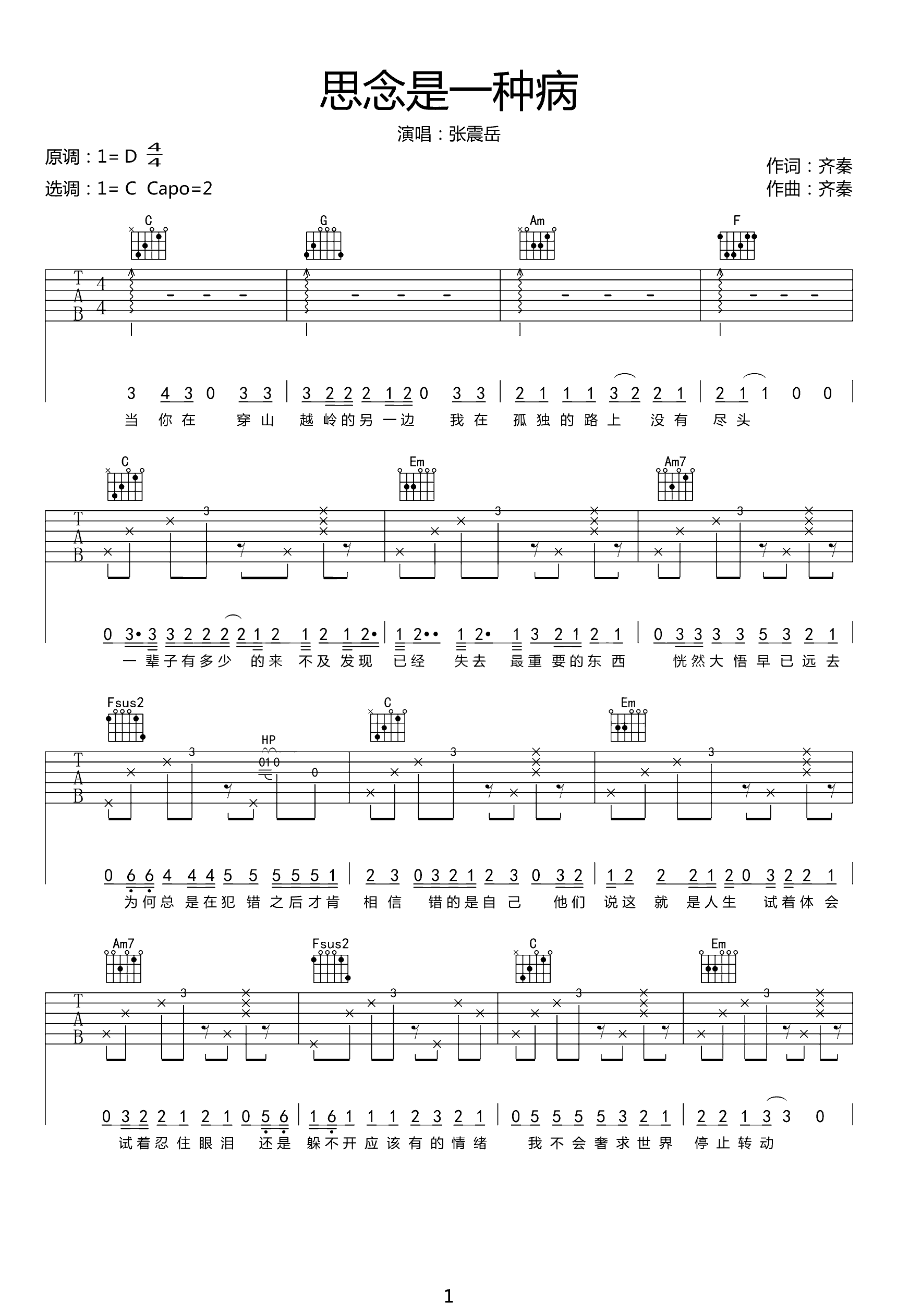思念是一种病吉他谱 - 张震岳 - C调吉他弹唱谱