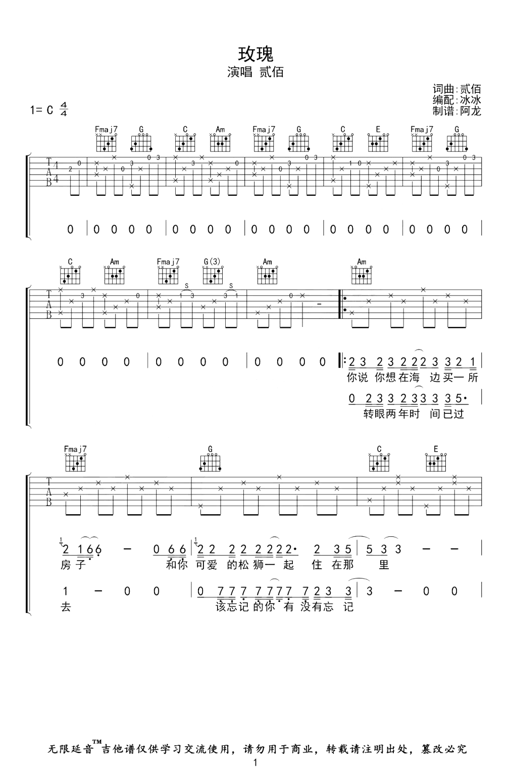 玫瑰吉他谱 - 贰佰 - C调吉他弹唱谱