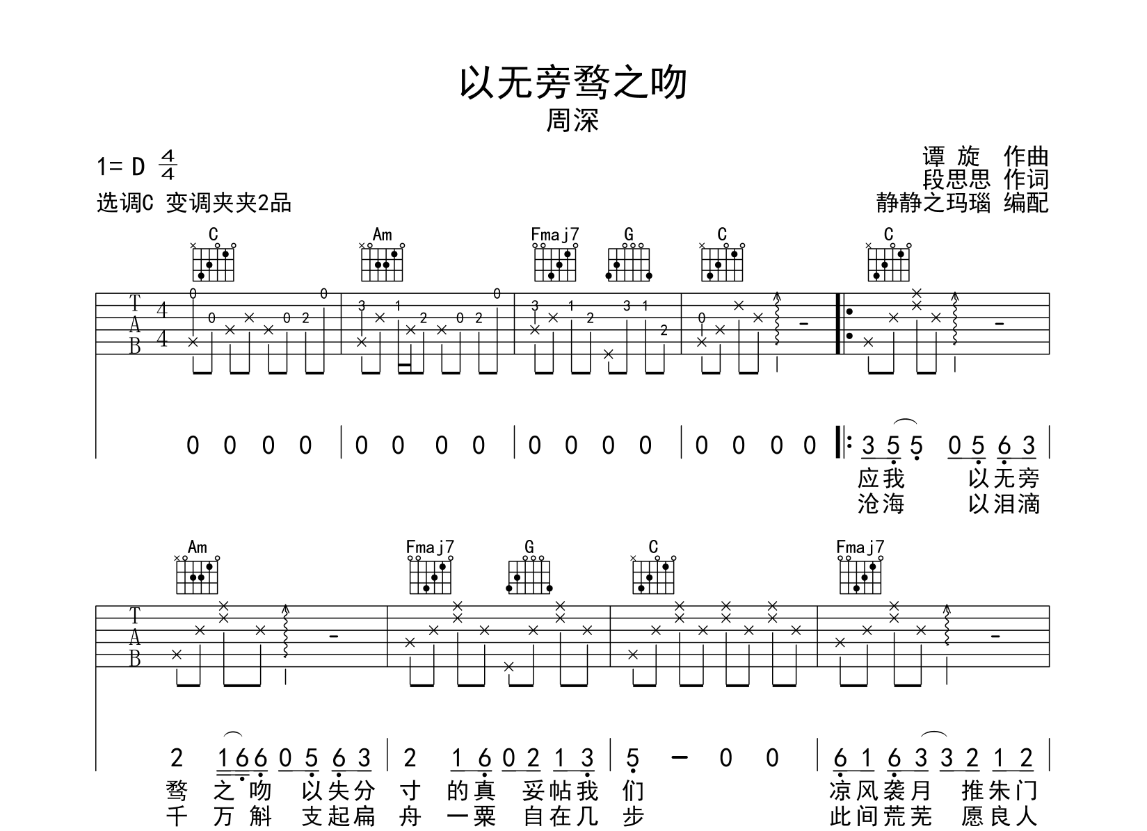 曲谱介绍: 周深《以无旁骛之吻》吉他谱,由创作者李静制谱,C调指法编配,《以无旁骛之吻》弹唱六线谱,节奏为4/4拍,速度为75拍每分钟,弹唱建议变调夹夹2品,也可以根据个人嗓音找到一个舒服的位置,难度初级。
