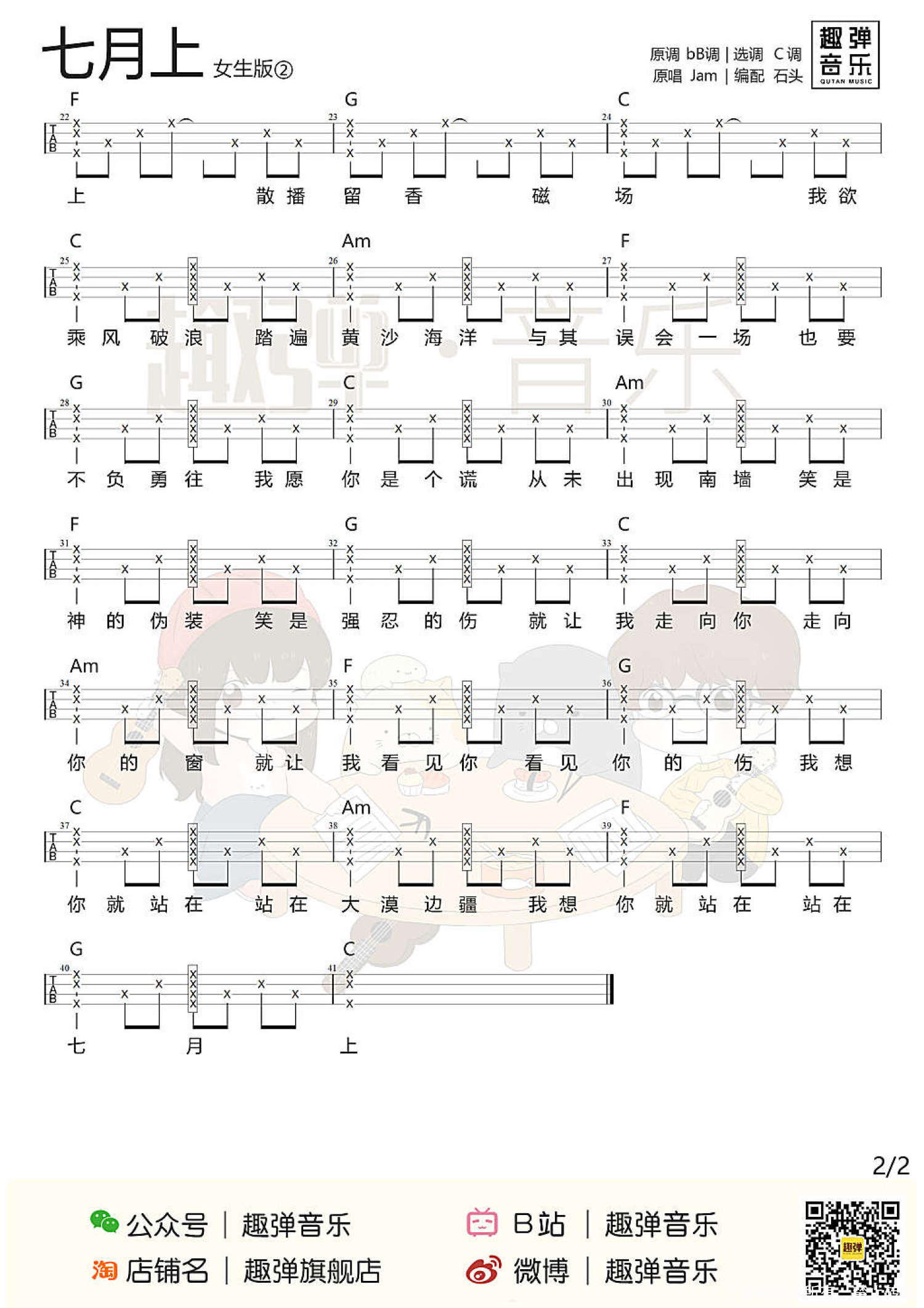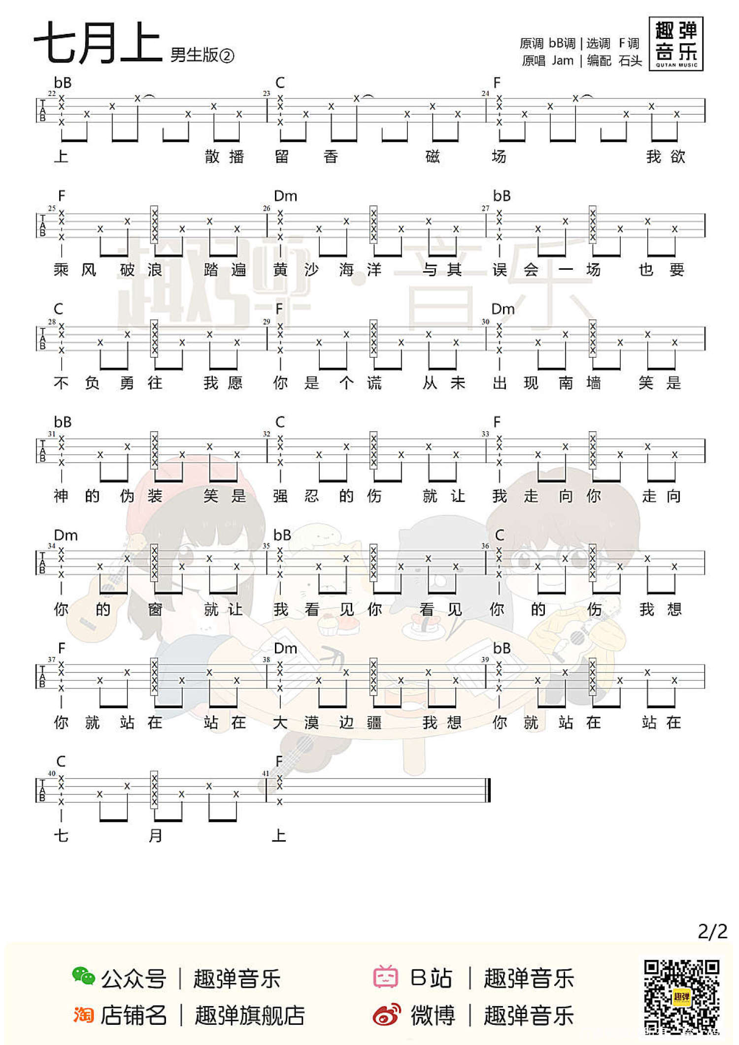 曲谱介绍: Aloha~今天石头老师要跟 大家分享一首非常好听经典的民谣歌曲 Jam的「七月上」 这首歌清新自然 歌词都是押“ang”的韵 唱起来郎朗上口 也没有复杂的和弦 超级适合新手练习!   弹唱演示    弹唱教学 在零基础弹唱教学中也用到了《七月上》,石头老师教的版本与原来的不同,加入了拍弦,让歌曲听起来更欢快一些~    弹唱曲谱 1、男声版   2、女声版