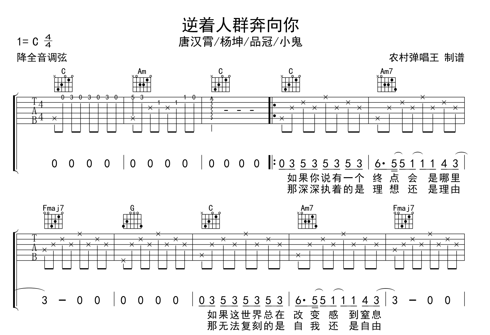 逆着人群奔向你吉他谱 - 唐汉霄/杨坤/品冠/小鬼 - C调吉他弹唱谱