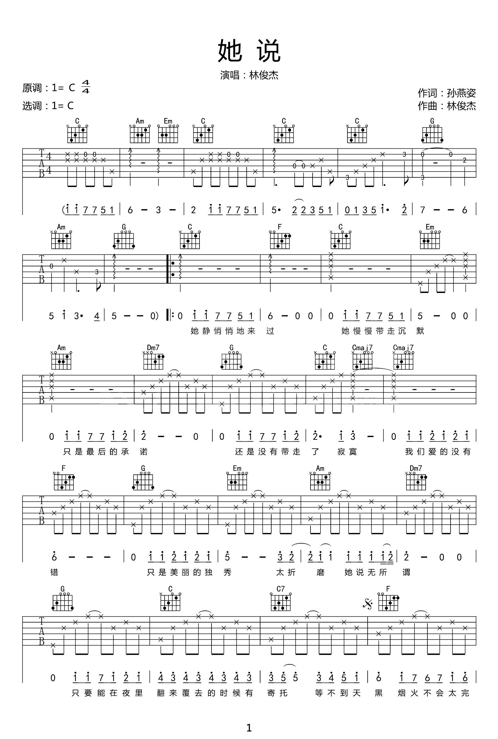 她说吉他谱 - 林俊杰 - C调吉他弹唱谱 - 原版