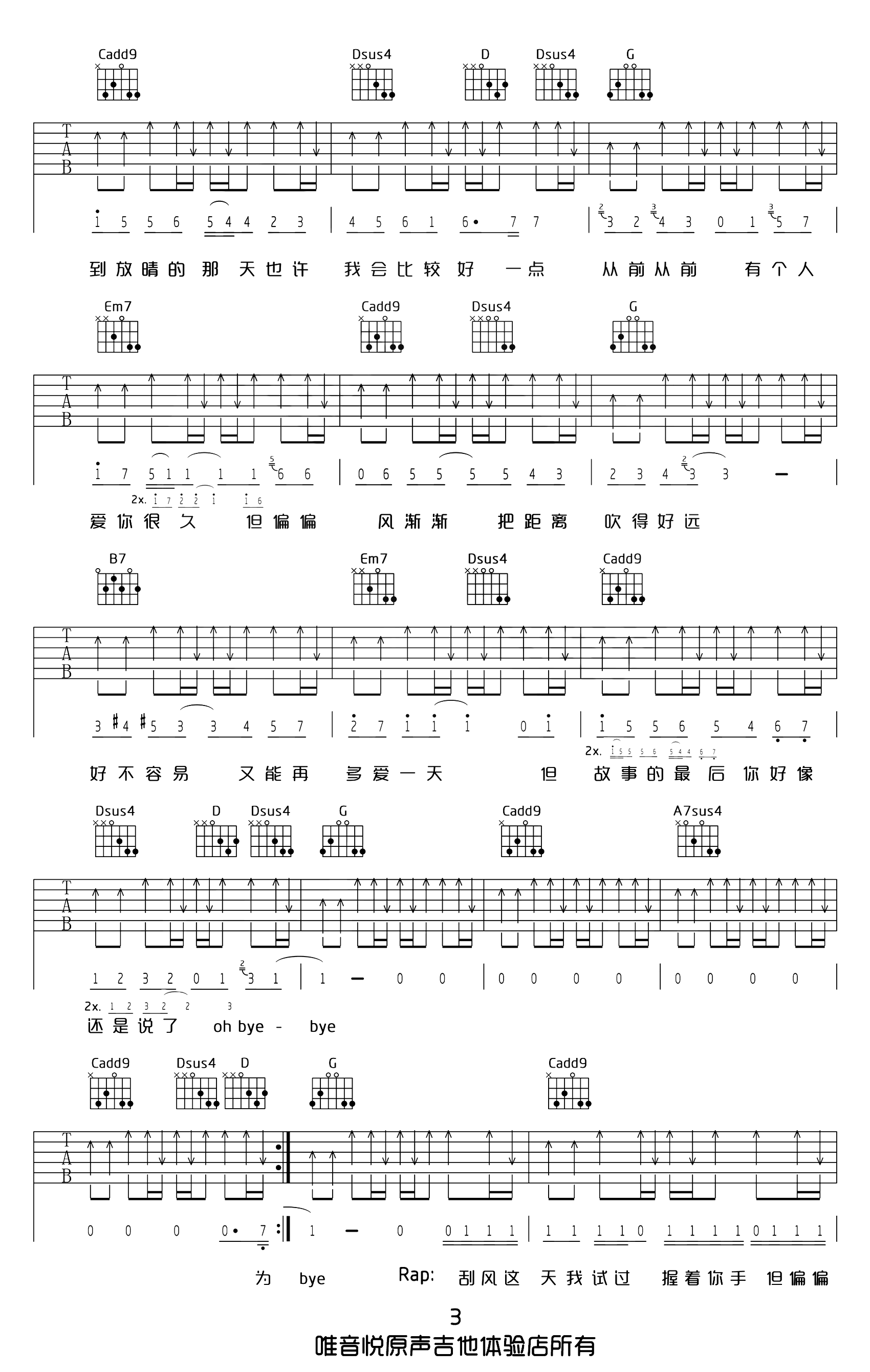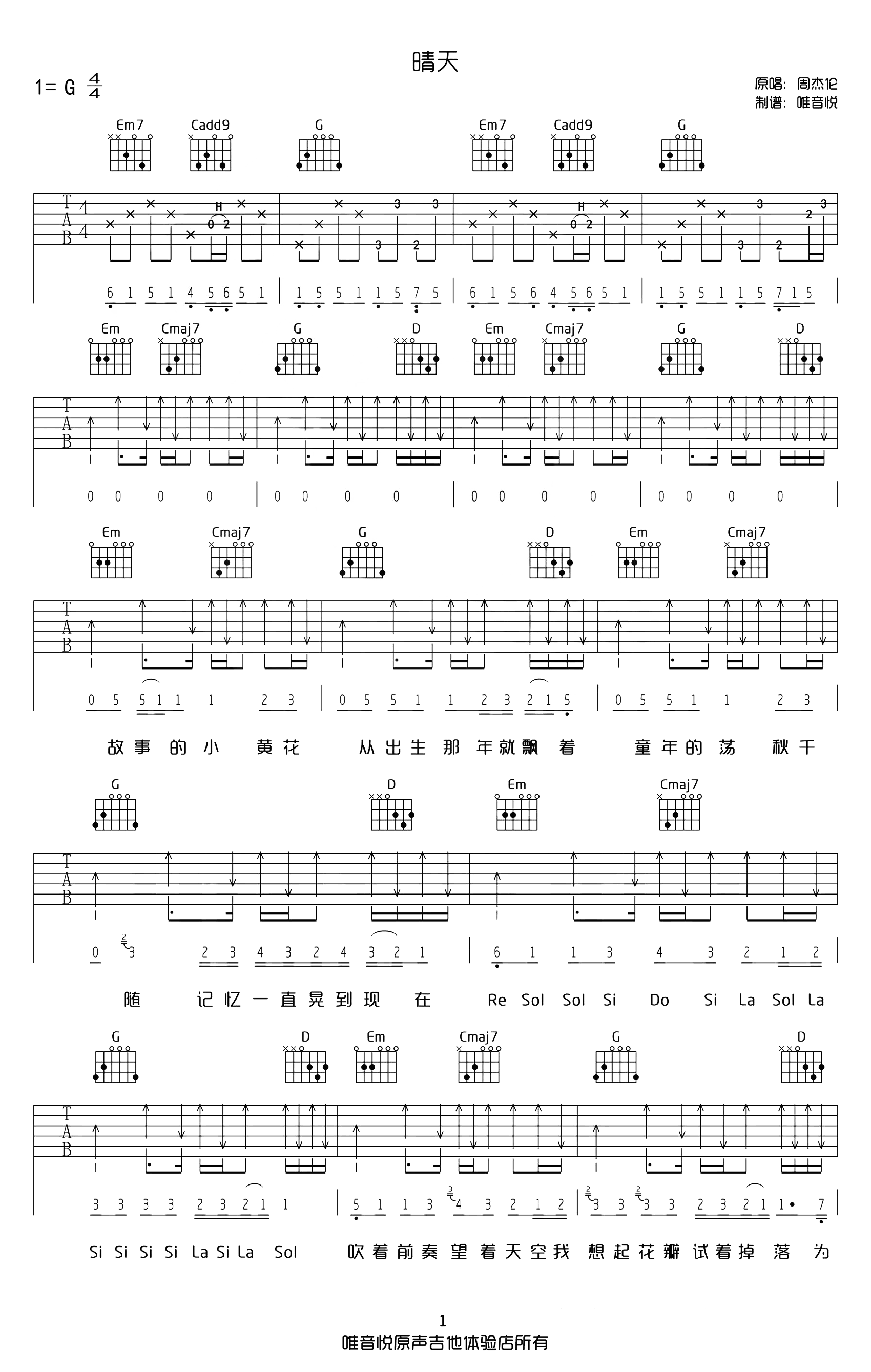曲谱介绍: 晴天吉他谱【原版】,周杰伦原唱,选用G调指法不用变调夹,《晴天》弹唱六线谱,共四张高清图片谱例,节奏4/4拍,这个曲谱版本90%接近原版,Cmaj7的和弦使用比有的使用C和弦的版本更为合适(推荐),弹唱难度中级较简单,本谱由唯音悦编配制谱。 《晴天》吉他弹唱教学视频