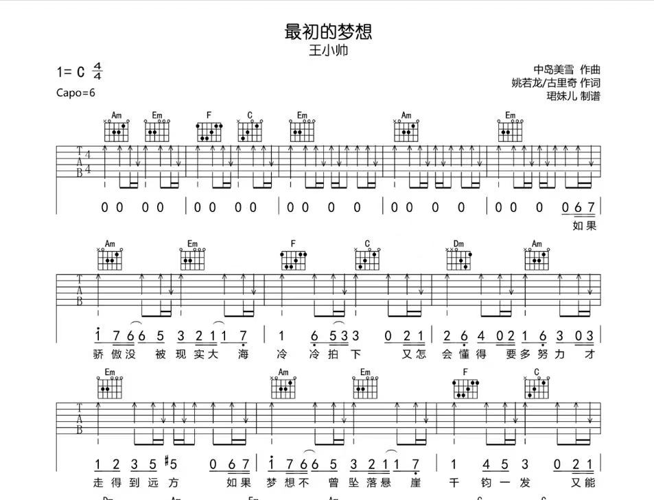 曲谱介绍: 王小帅《最初的梦想》吉他谱,本谱采用C调指法编配,弹唱建议变调夹6品,速度85BPM,难度较简单,易上手。
