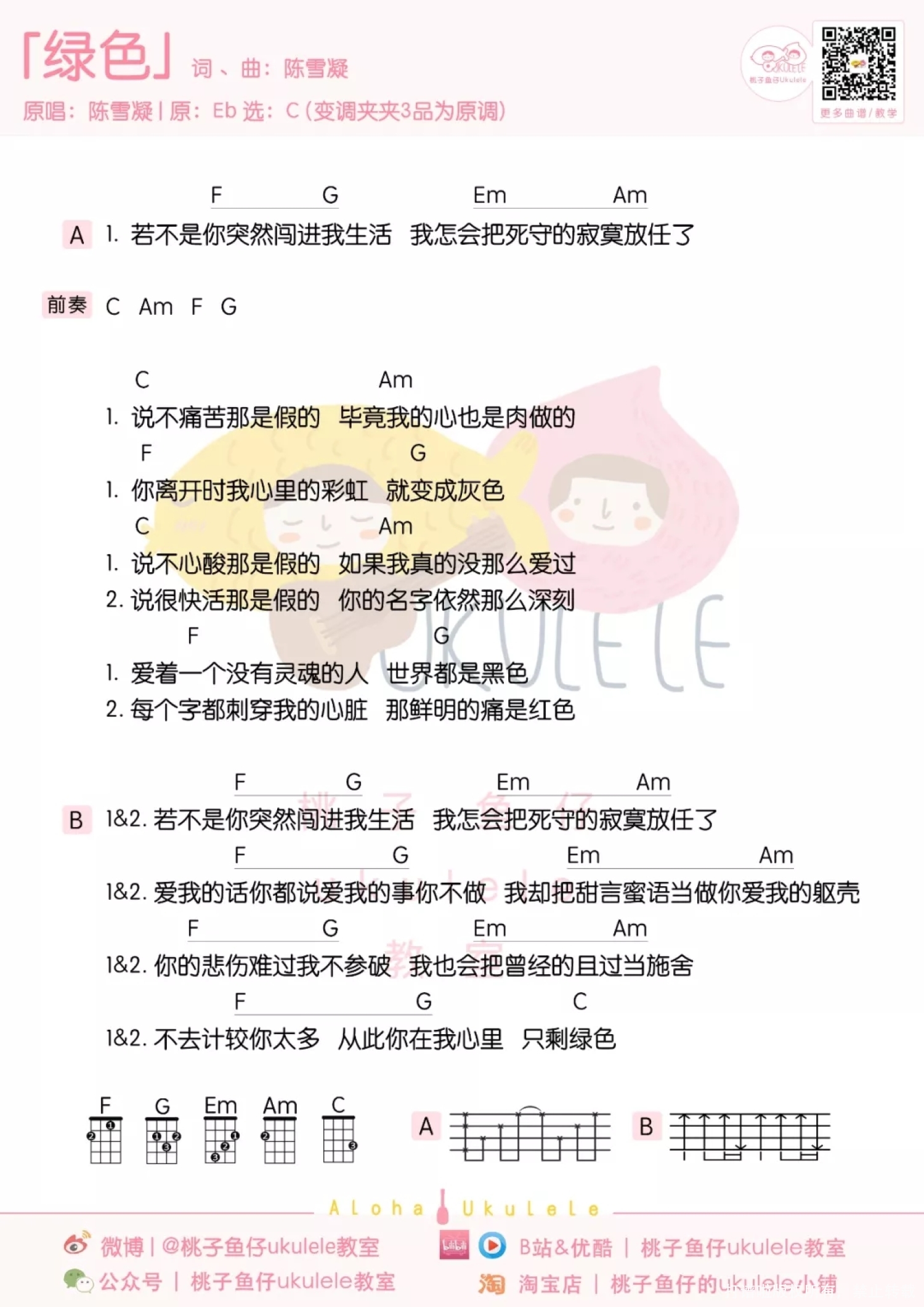 曲谱介绍: 《绿色》陈雪凝二专第六支单曲。 黑色、绿色、红色在感情的世界里任意游离, 我们却忘记了它最初的颜色。   绿色尤克里里弹唱谱   绿色尤克里里指弹cover   绿色ukulele指弹教学   绿色ukulele指弹谱
