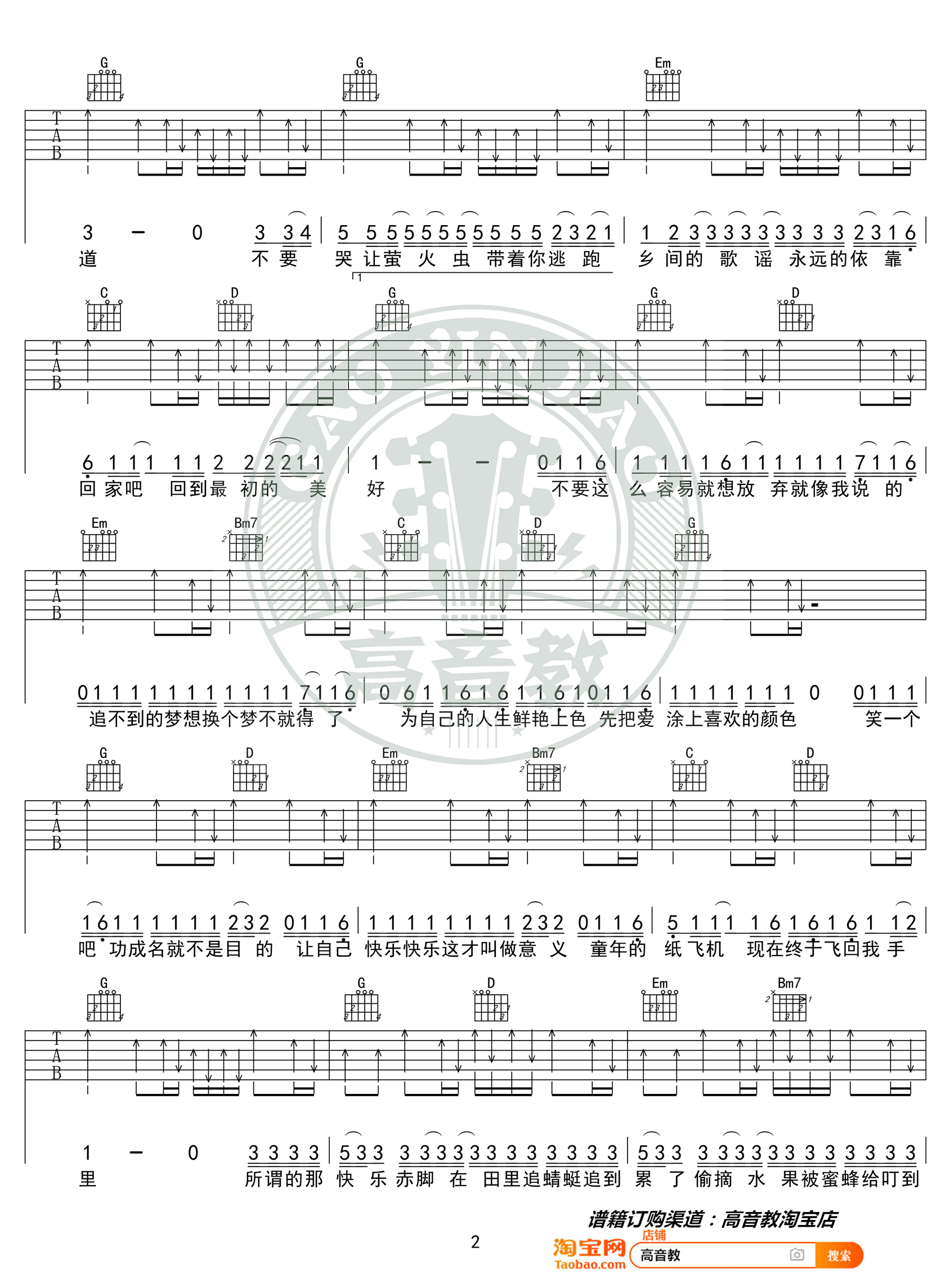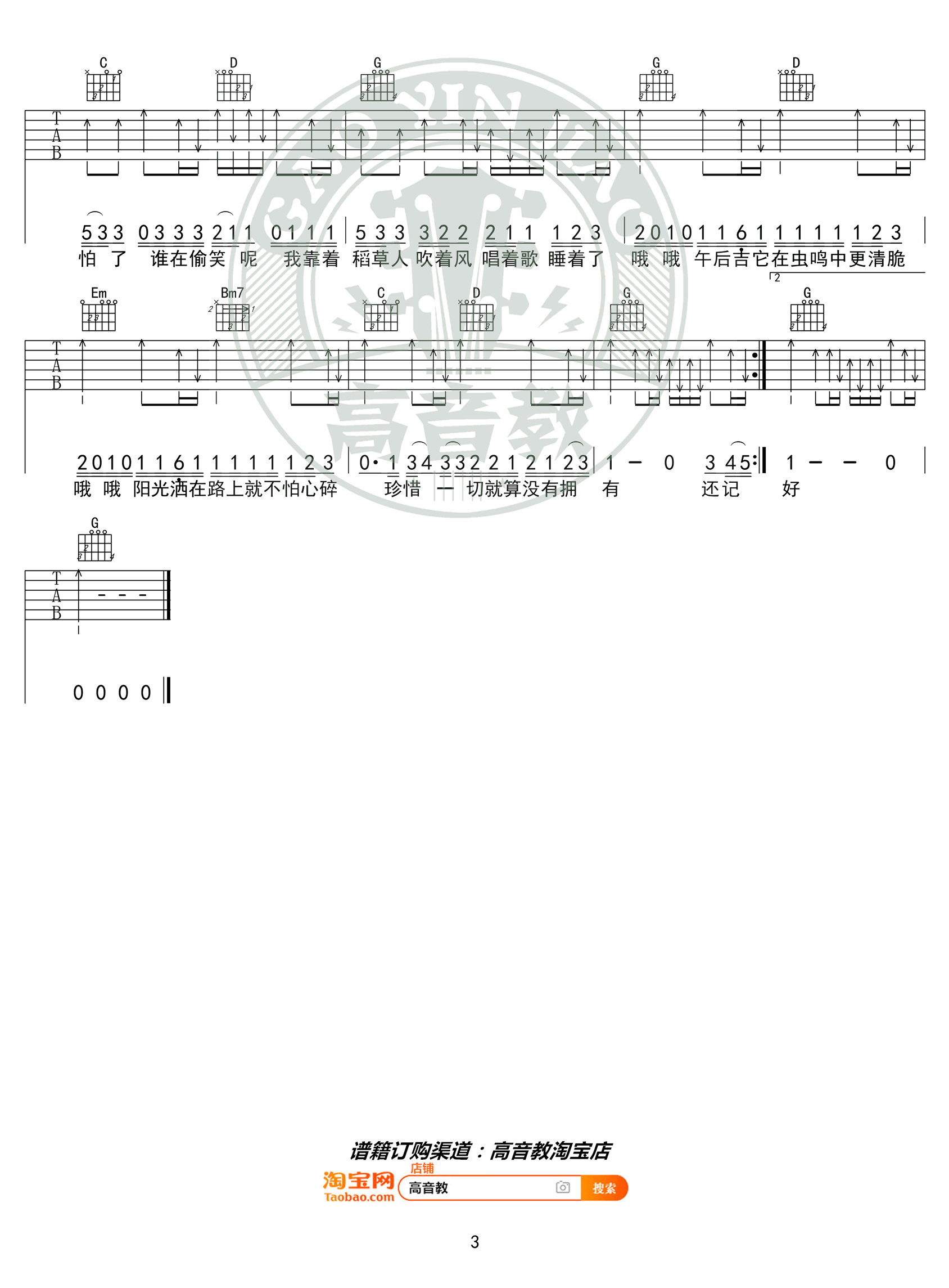 曲谱介绍: 周杰伦《稻香》吉他弹唱谱,采用G调指法编配,高音教编配出品,共有3张高清图谱。