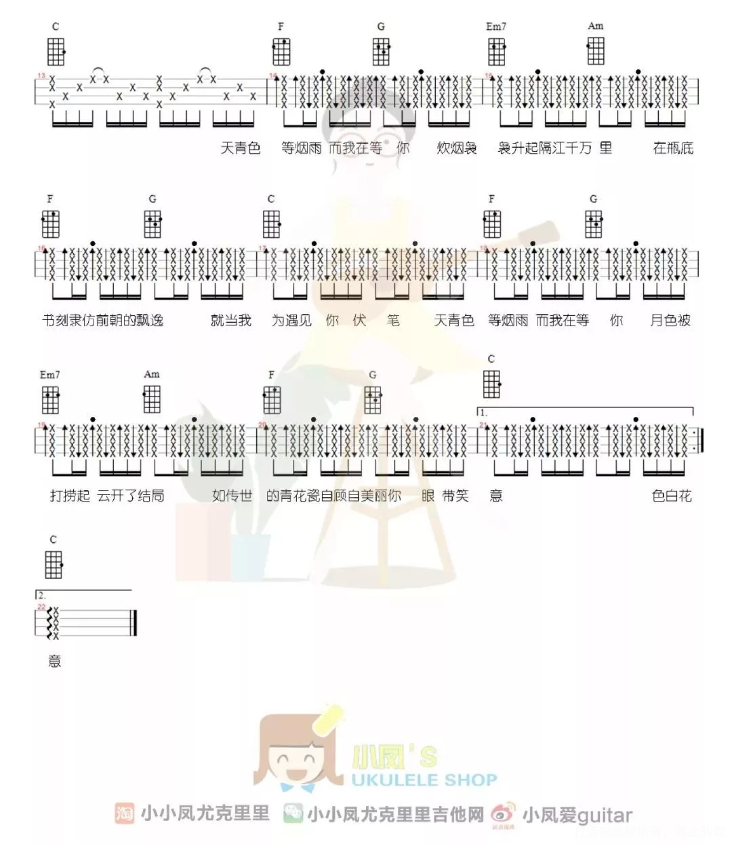 曲谱介绍: 形容女子如瓷器,大抵应该是取其美好易碎的意向。 而瓷中有“青花”,像你。 在瓶底书汉隶,只为遇见你而伏笔。 那年江南,小镇阴雨绵绵,不宜出行 帘外芭蕉惹骤雨,而我一不小心惹了你。 爱情如同瓷器易碎,月色晕染的结局,眼带笑意的你,是一幅美好的画,也只是我的回忆。 我执起画笔,想勾勒一个你,眉眼却画不清晰 搁笔至此,推门而出,听雨声。炊烟升起,隔江千万里。 你的美就此飘散,去了我去不到的地方。   本期翻弹 这一期的翻弹,小凤拾起了好久没练过的古筝,跟小爱一起,合奏了这首来自于周董的经典曲目《青花瓷》,快点开视频欣赏一下吧!   小凤小爱古筝改编《青花瓷》 视频下方同步更新男孩子和女孩子的尤克里里谱,希望大家快乐练琴,天天进步!   尤克里里和弦谱: 女声版   尤克里里 详谱: 男声版   女声版