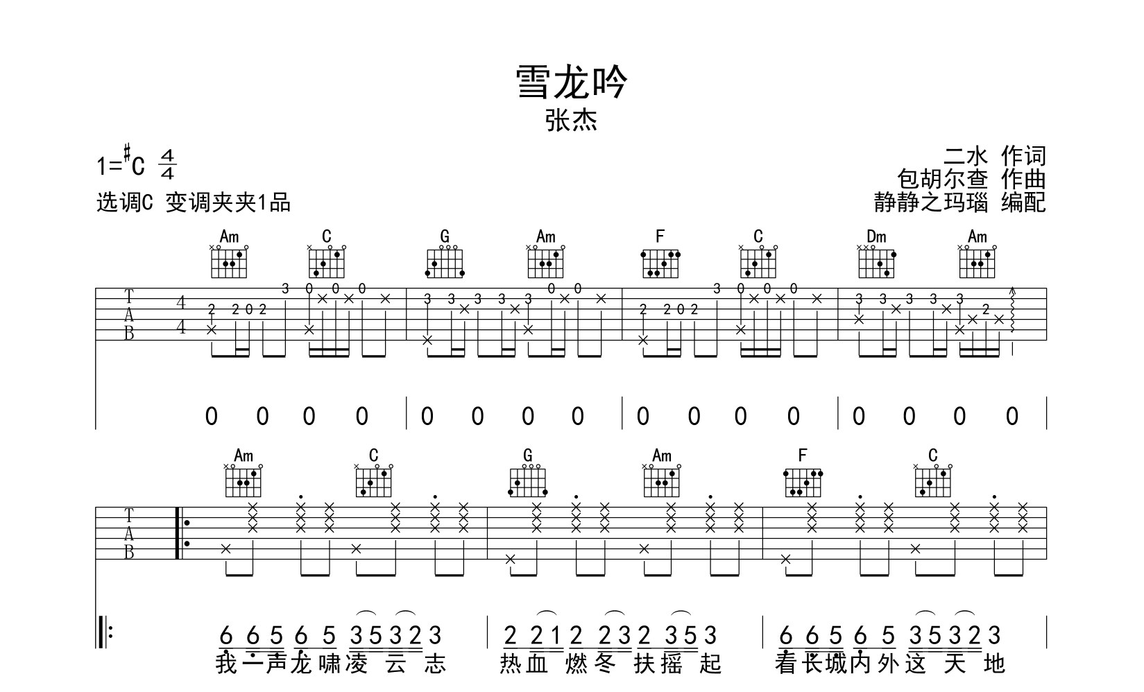 曲谱介绍: 张杰《雪龙吟》吉他谱,由静静之玛瑙制谱,本谱采用C调和弦指法编配,节奏为4/4拍,速度为100拍每分钟,弹唱建议变调夹夹1品,含前奏按原版编配,弹唱的难度适中。