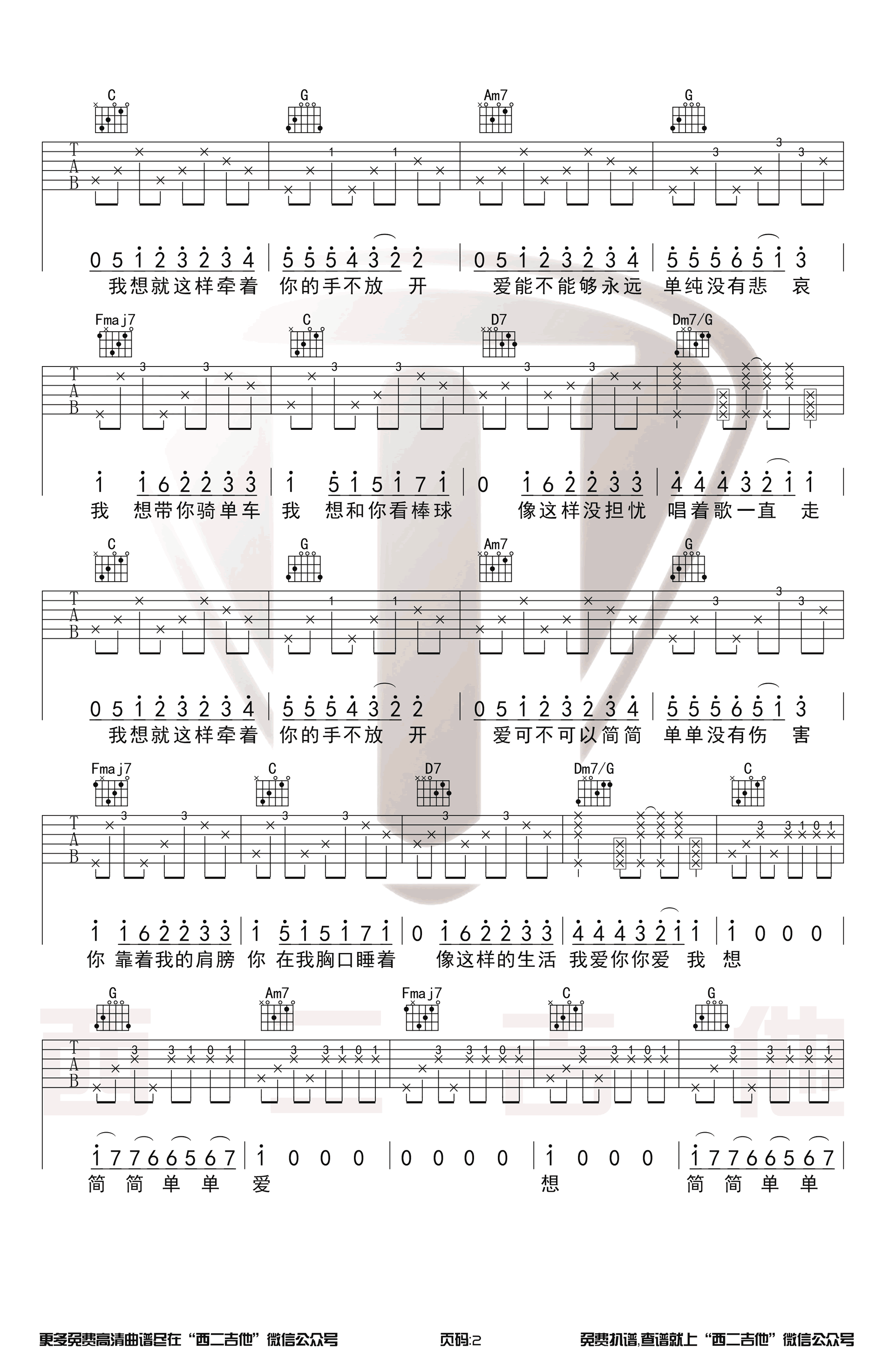 曲谱介绍: 周杰伦《简单爱》吉他弹唱谱,采用C调指法编配,西二吉他编配出品,共有3张高清图谱。