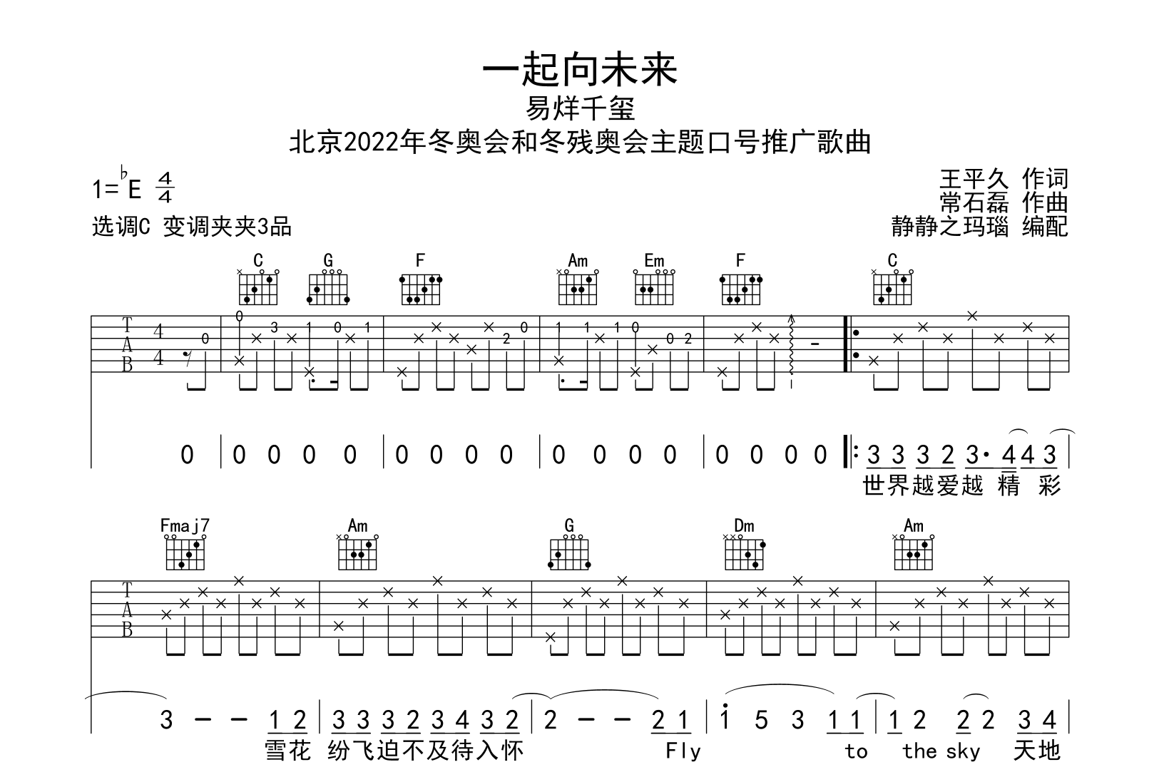 曲谱介绍: 由创作者李静制谱的《一起向未来》吉他谱,易烊千玺演唱,选用C调,原调bE,《一起向未来》吉他弹唱谱,共两张高清图片谱,节奏为4/4拍,速度为110拍每分钟,弹唱建议变调夹夹3品,难度初级。