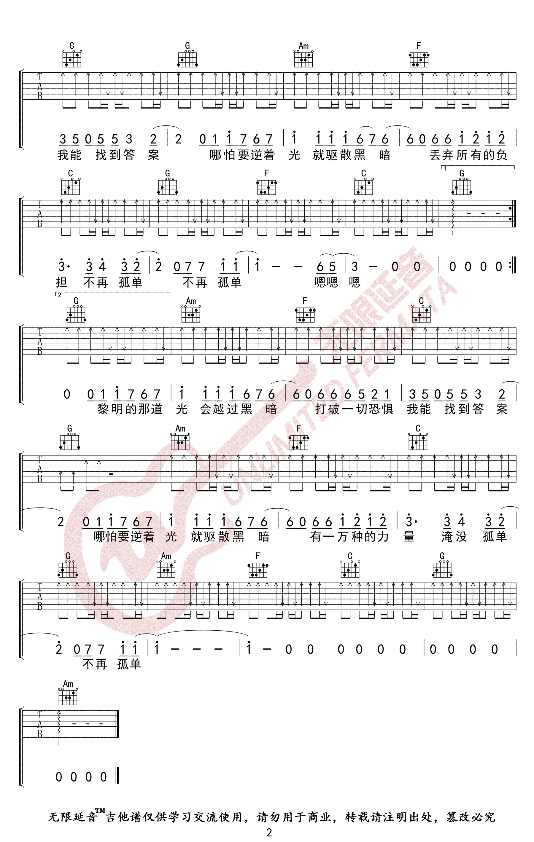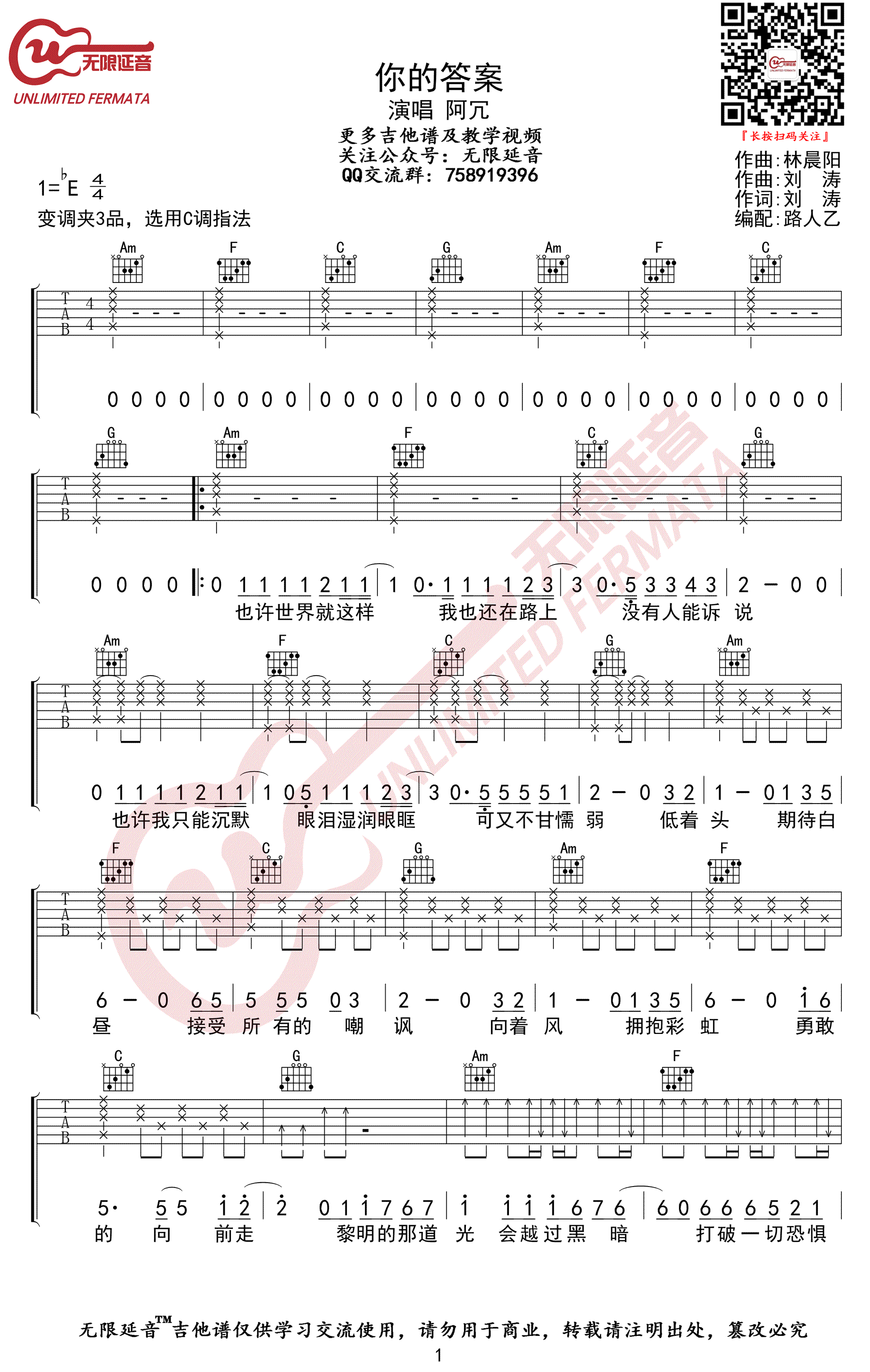 曲谱介绍: 阿冗《你的答案》吉他弹唱谱,采用C调指法编配,无限延音编配出品,共有2张高清图谱,免翻页排版设计。