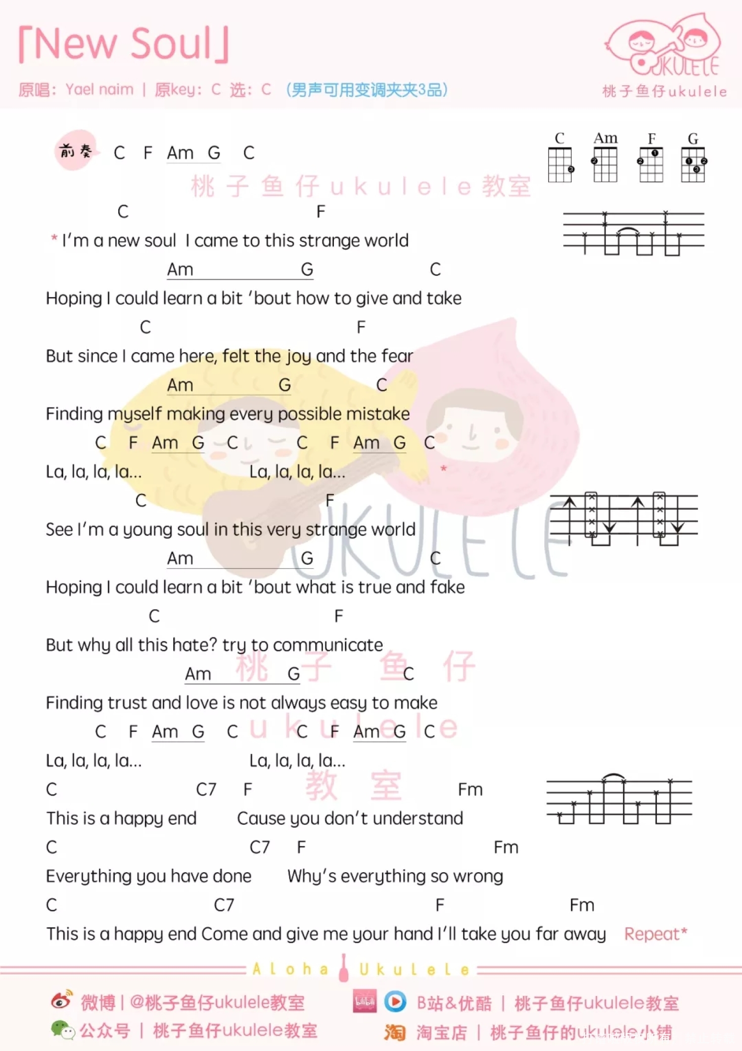 曲谱介绍: 弹唱教学 目录 俏皮可爱的民谣小曲 本月弹唱任务来自Yael Naim的《New Soul 纯净心灵》。一首俏皮可爱的民谣式小调,超适合释放并沉淀心灵的歌曲哦~ 希望在繁忙的工作和学习过后,Yael清澈无暇的声音,可以给各位琴友带去治愈的力量!感受一下自己的Young & New Soul吧!跟着香蕉小姐姐弹唱起来吧~ 2008年1月, 苹果公司首席执行官史蒂夫·乔布斯 选择《New Soul》作为新产品 MacBook Air的广告曲, 耶尔·内姆因此一举成名。 这首歌轻灵,明快~ 辗转婉乘中,心底里的快乐和轻松 迅速的被这样的律动并激发, 真的是一首“洁净心灵”的乐曲。   尤克里里吉他弹唱 Cover by @香蕉U   弹唱教学