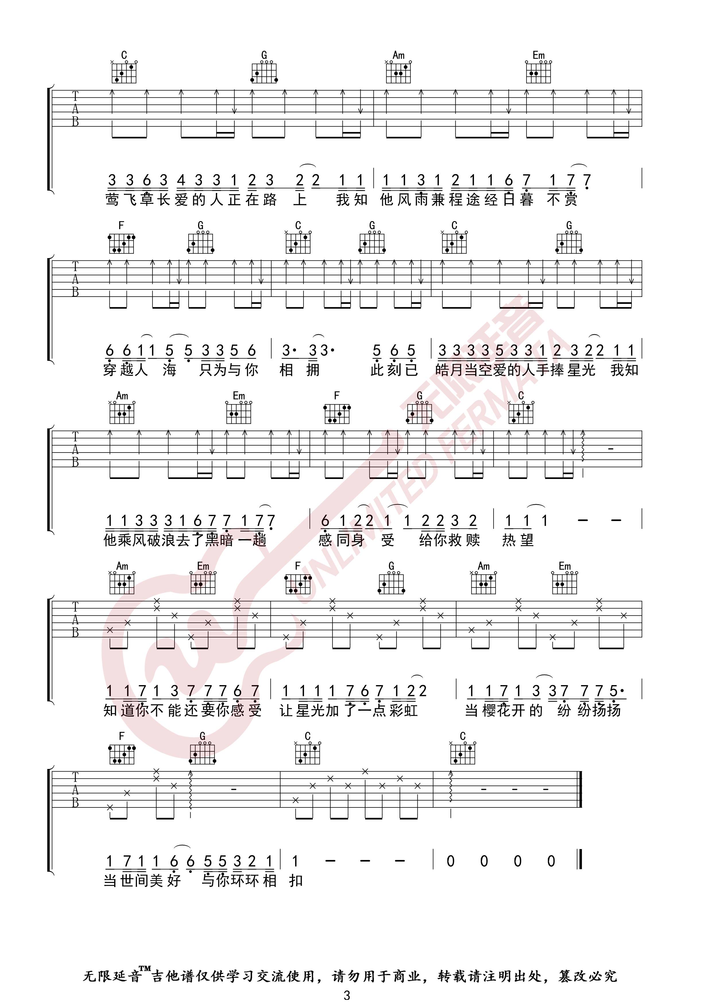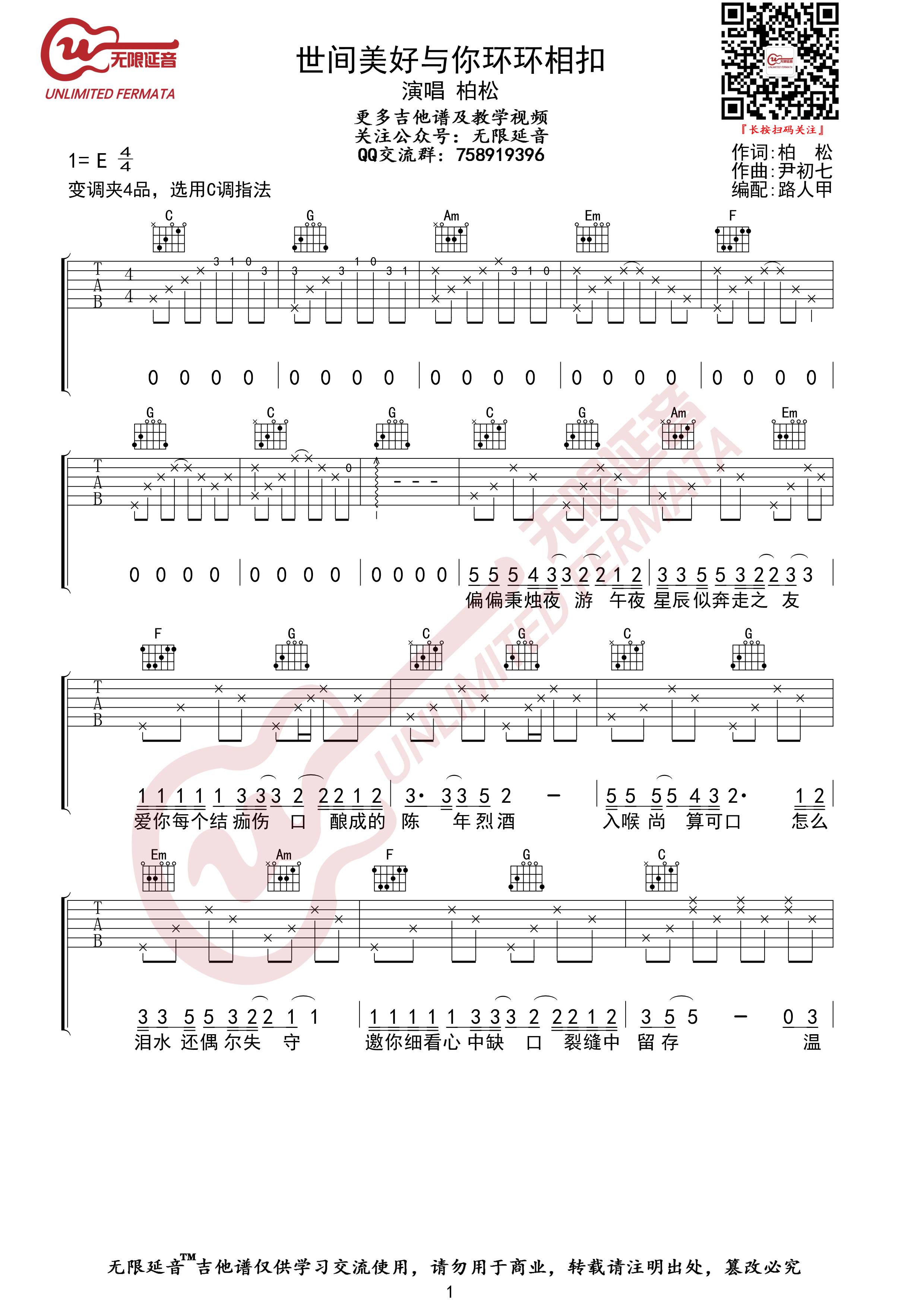 曲谱介绍: 柏松《世间美好与你环环相扣》吉他弹唱谱,采用C调指法编配,无限延音编配出品,共有3张高清图谱。