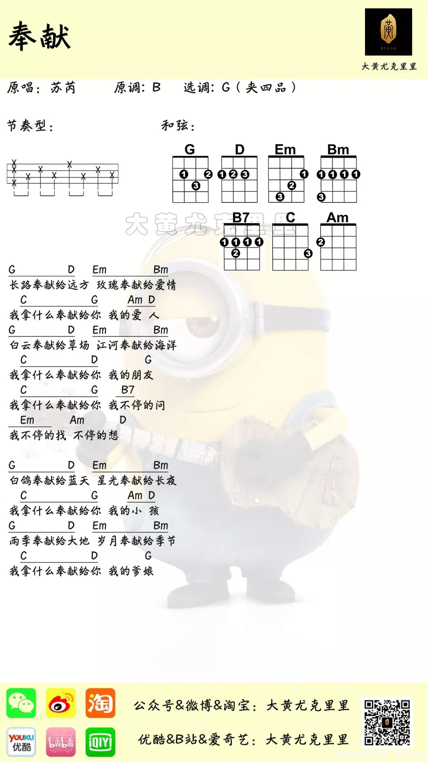 曲谱介绍: 苏芮《奉献》尤克里里谱,共有1张高清图谱,免翻页排版设计。
