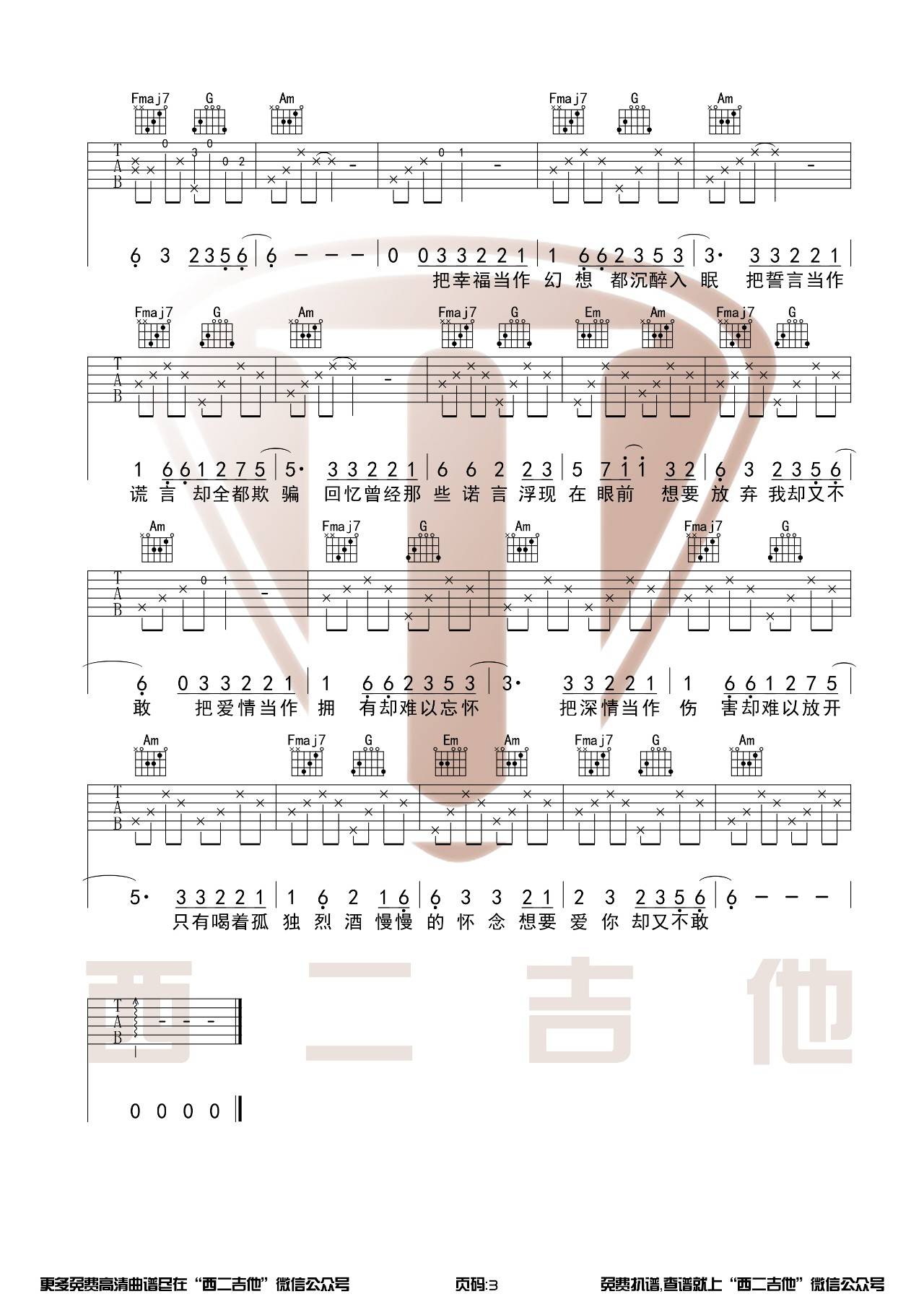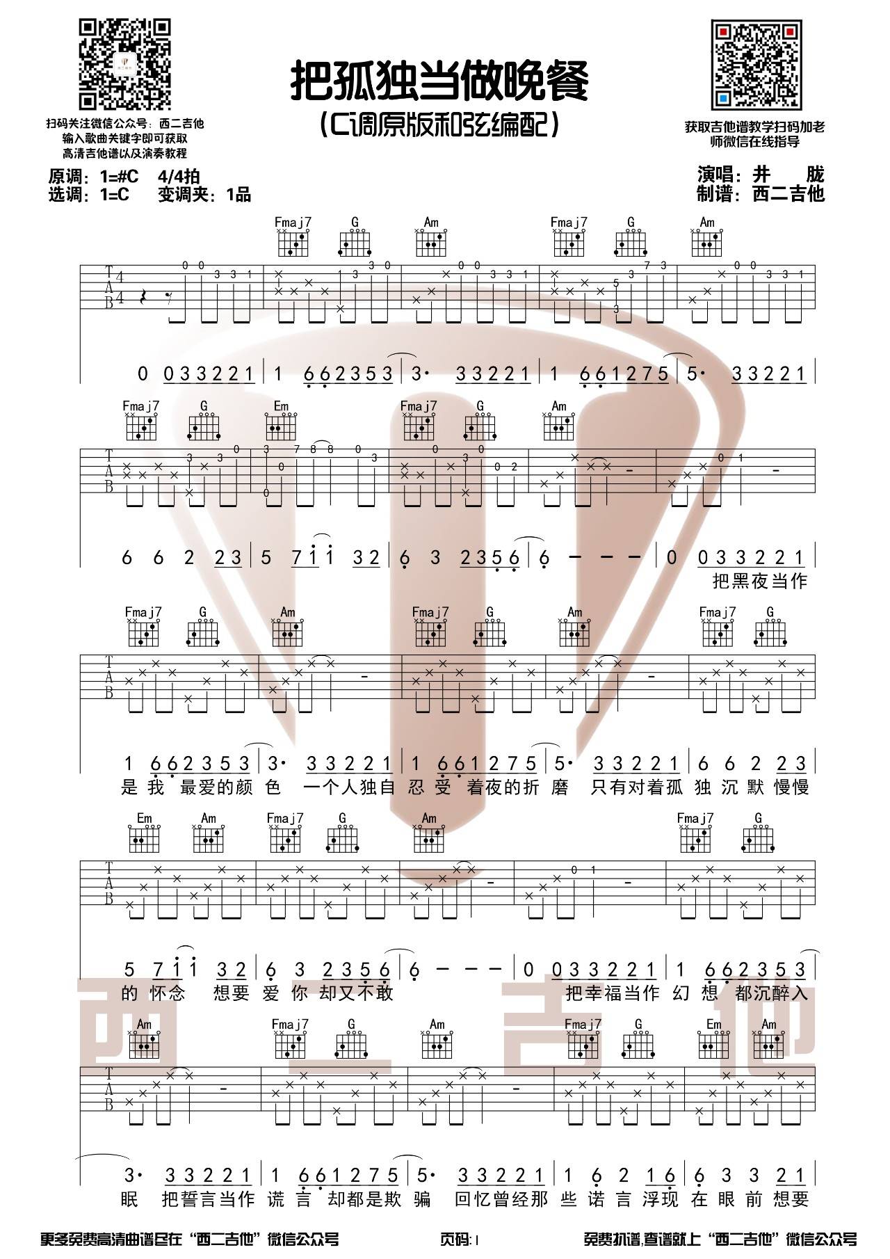曲谱介绍: 井胧《把孤独当做晚餐》吉他弹唱谱,采用C调指法编配,西二吉他编配出品,共有3张高清图谱。
