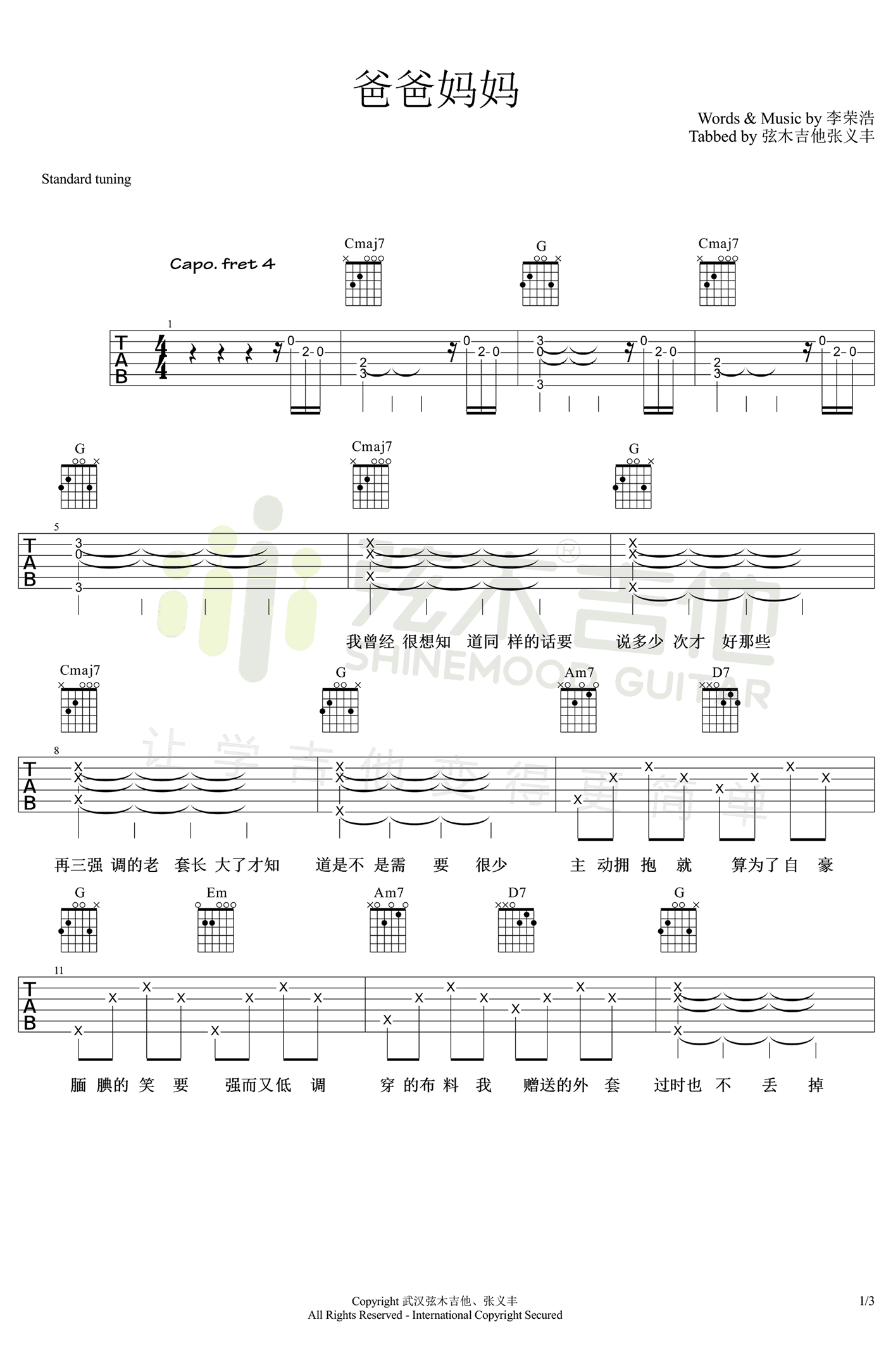 曲谱介绍: 李荣浩《爸爸妈妈》吉他弹唱谱,采用C调指法编配,弦木吉他编配出品,共有3张高清图谱。