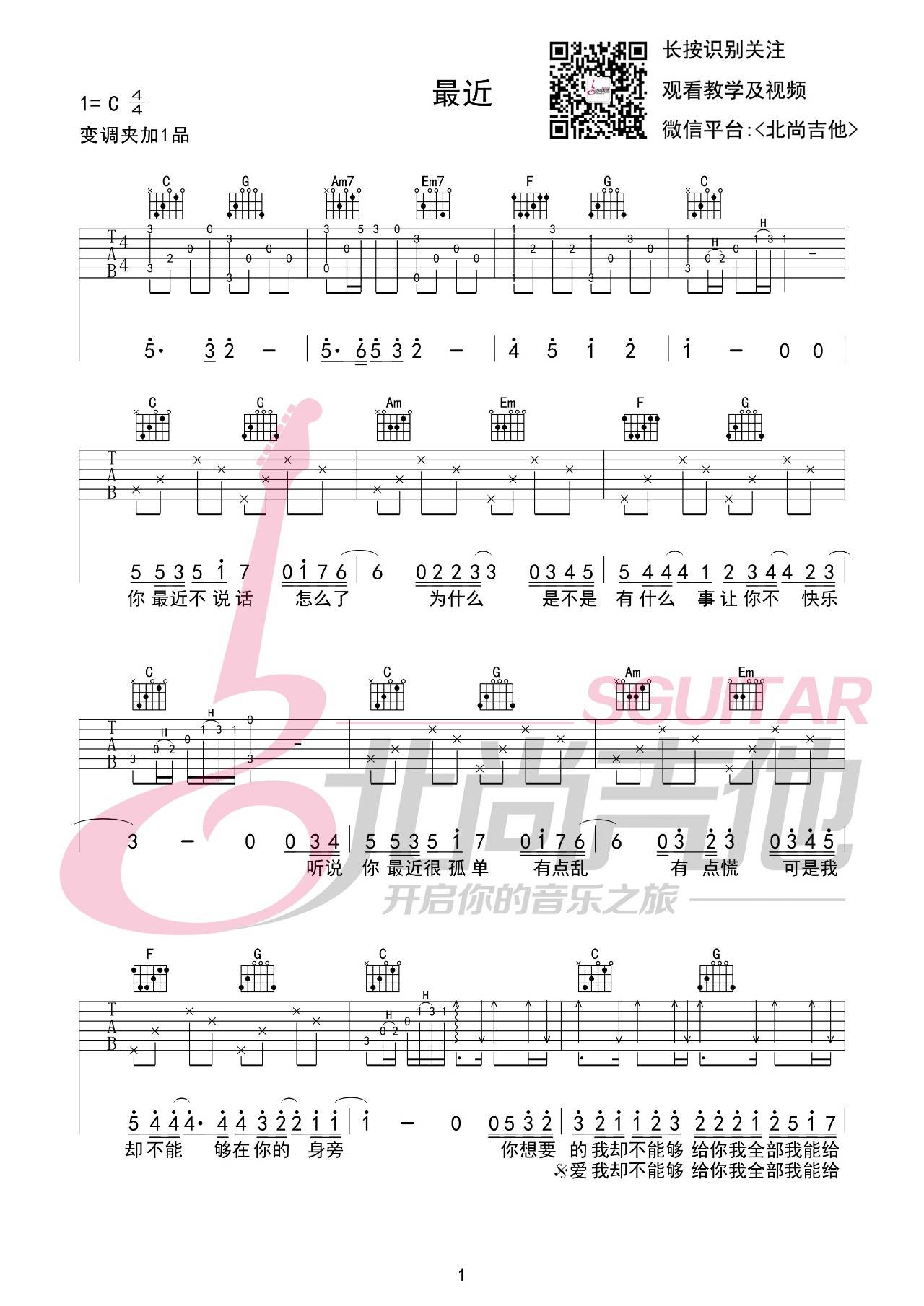 曲谱介绍: 李圣杰《最近》吉他弹唱谱,采用C调指法编配,北尚吉他编配出品,共有2张高清图谱,免翻页排版设计。