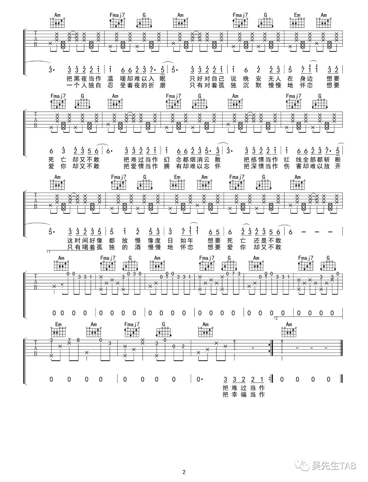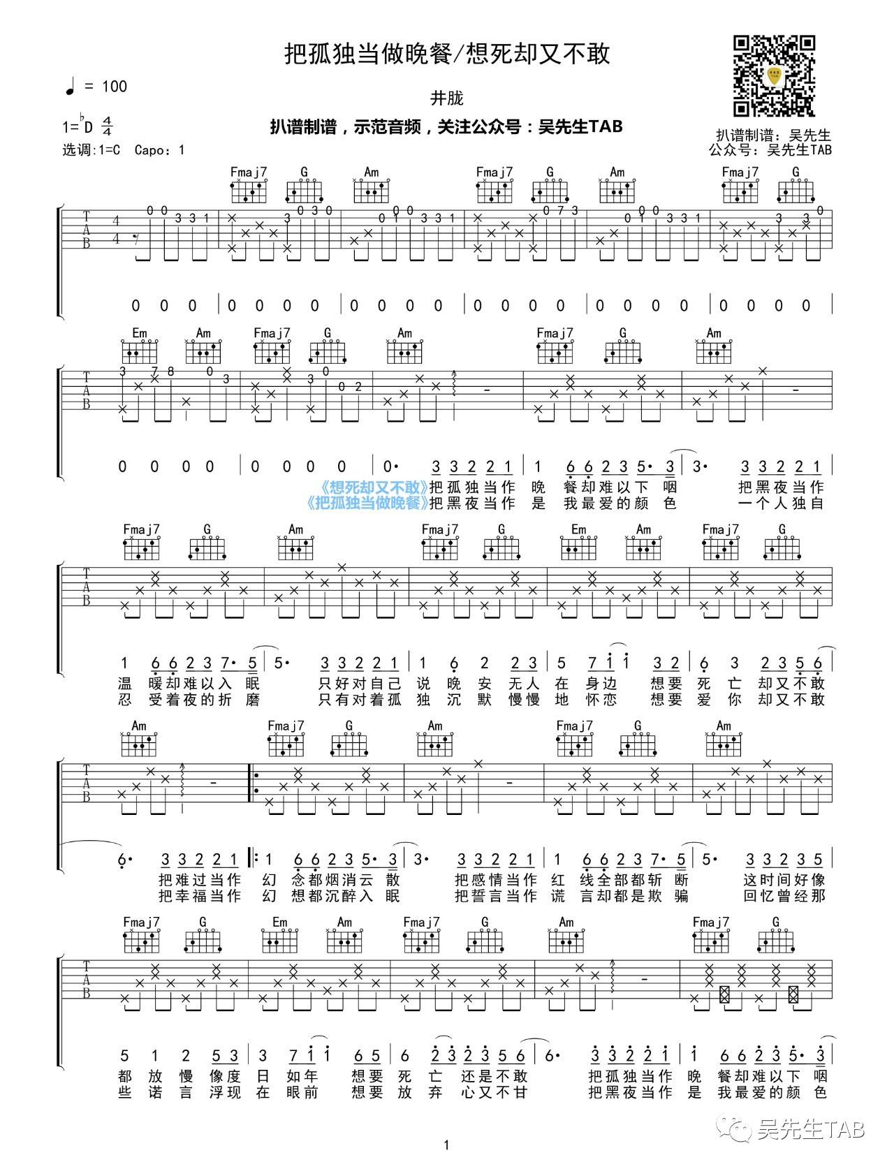 曲谱介绍: 把孤独当做晚餐《想死却又不敢》吉他弹唱谱,采用C调指法编配,共有2张高清图谱,免翻页排版设计。
