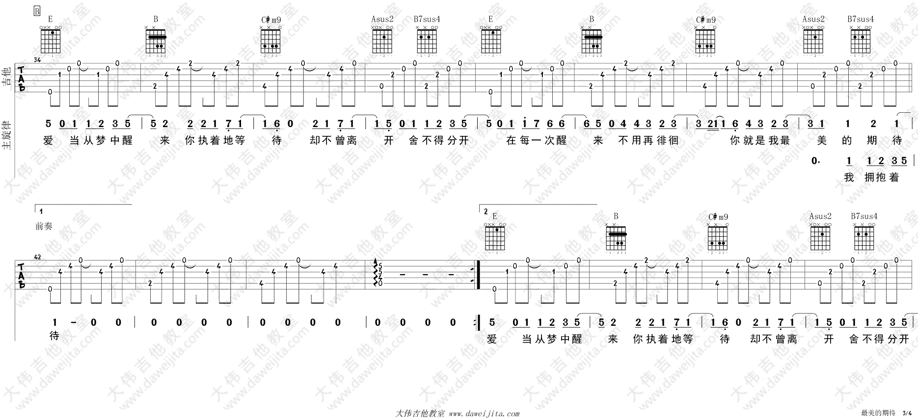 曲谱介绍: 南征北战翻唱《最美的期待》吉他弹唱谱,采用E调指法编配,大伟吉他教室编配出品,共有4张高清图谱。