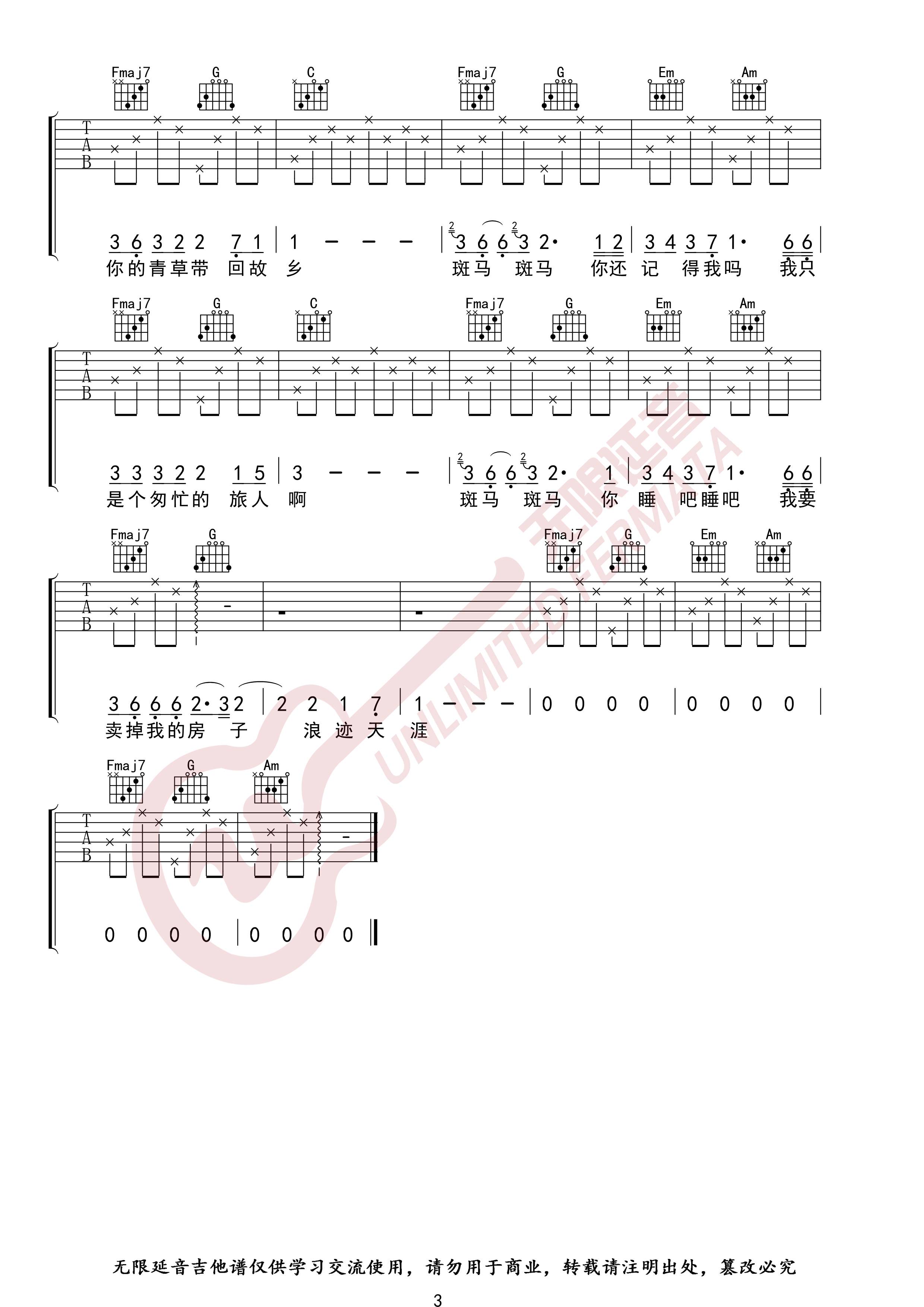 曲谱介绍: 宋冬野《斑马斑马》吉他弹唱谱,采用C调指法编配,共有3张高清图谱。