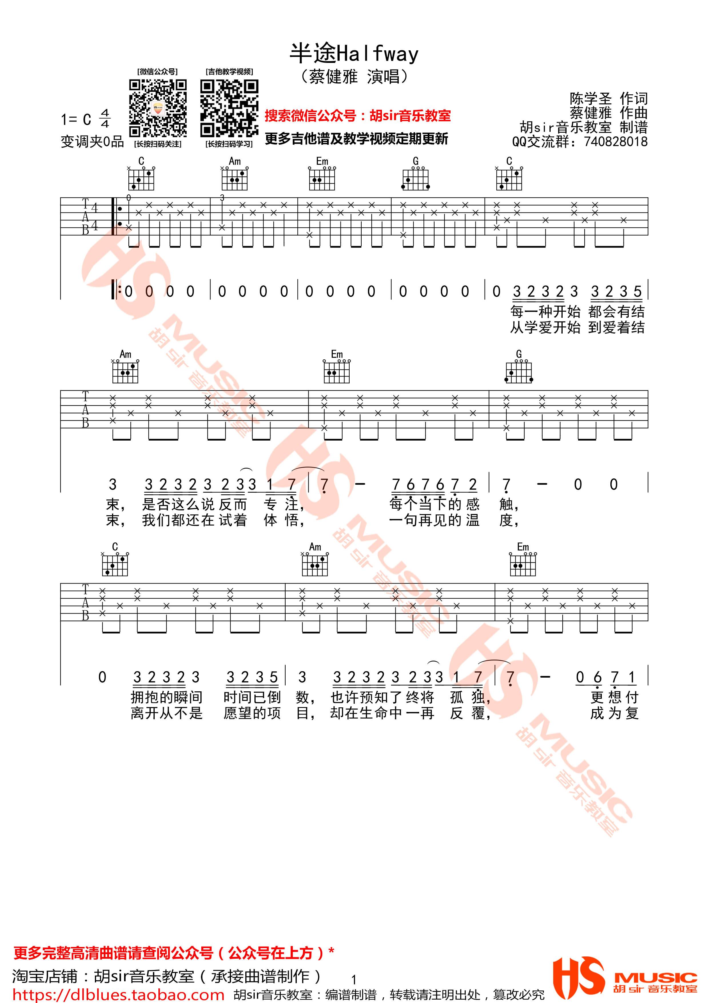 曲谱介绍: 蔡健雅《半途Halfway》吉他弹唱谱,采用C调指法编配,共有3张高清图谱。