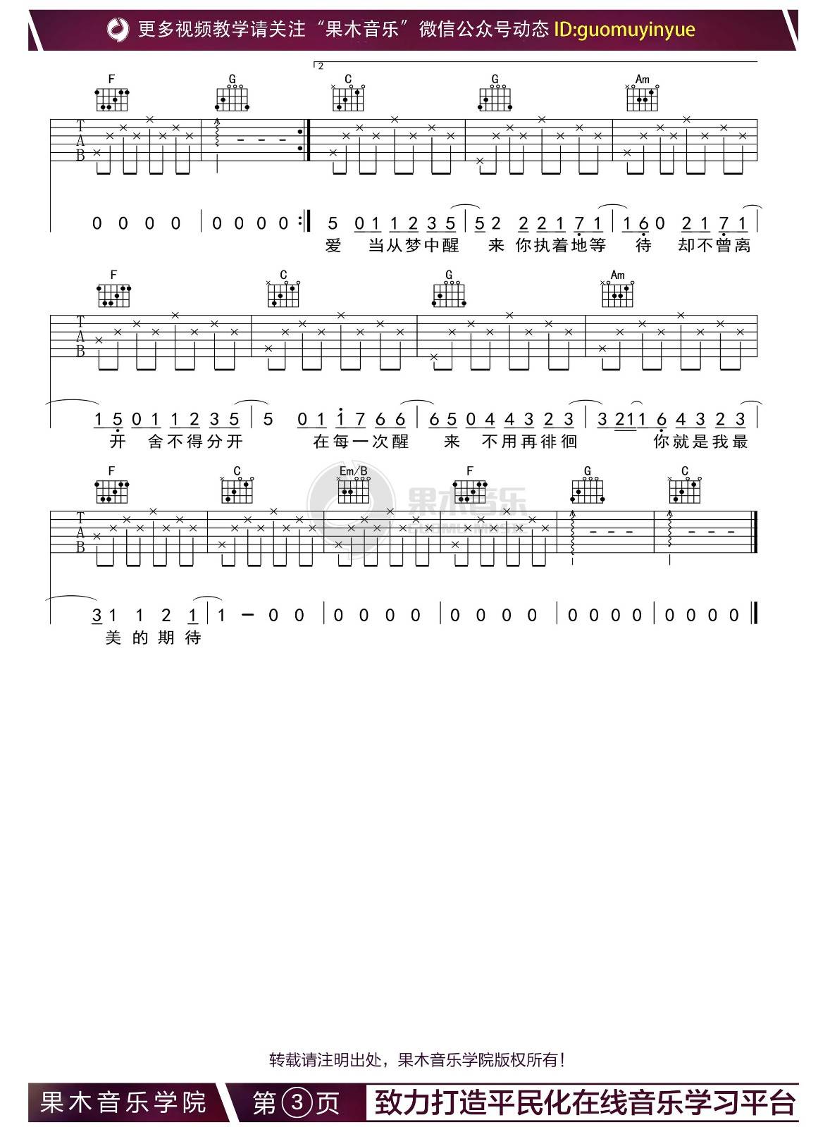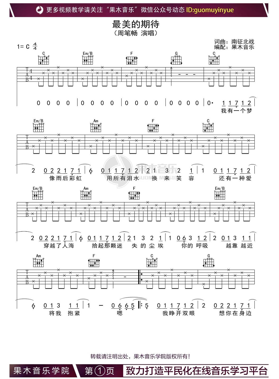 曲谱介绍: 周笔畅《最美的期待》吉他弹唱谱,采用C调指法编配,果木音乐编配出品,共有3张高清图谱。