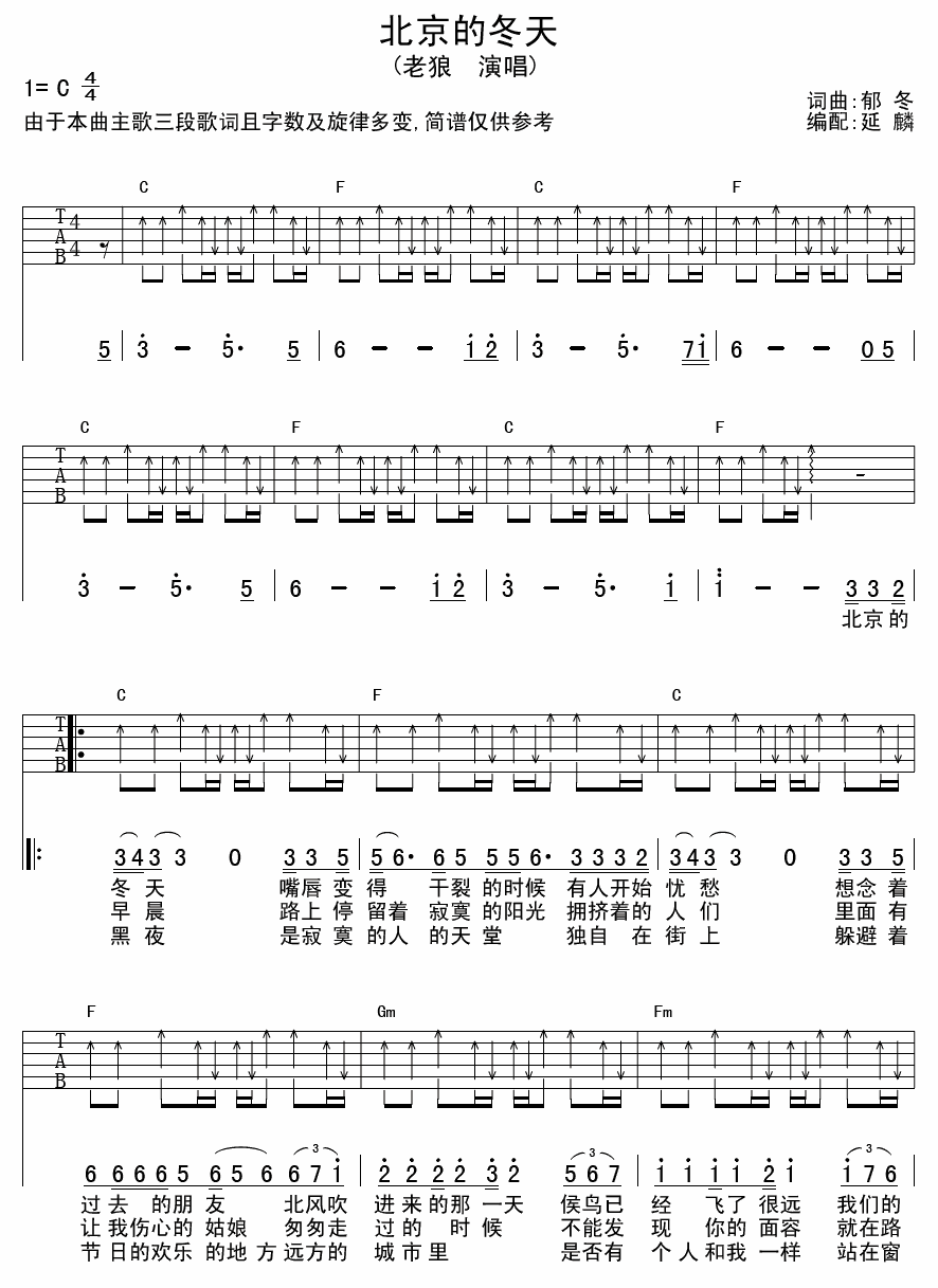 曲谱介绍: 老狼《北京的冬天》吉他弹唱谱,采用C调指法编配,延麟编配出品,共有2张高清图谱,免翻页排版设计。