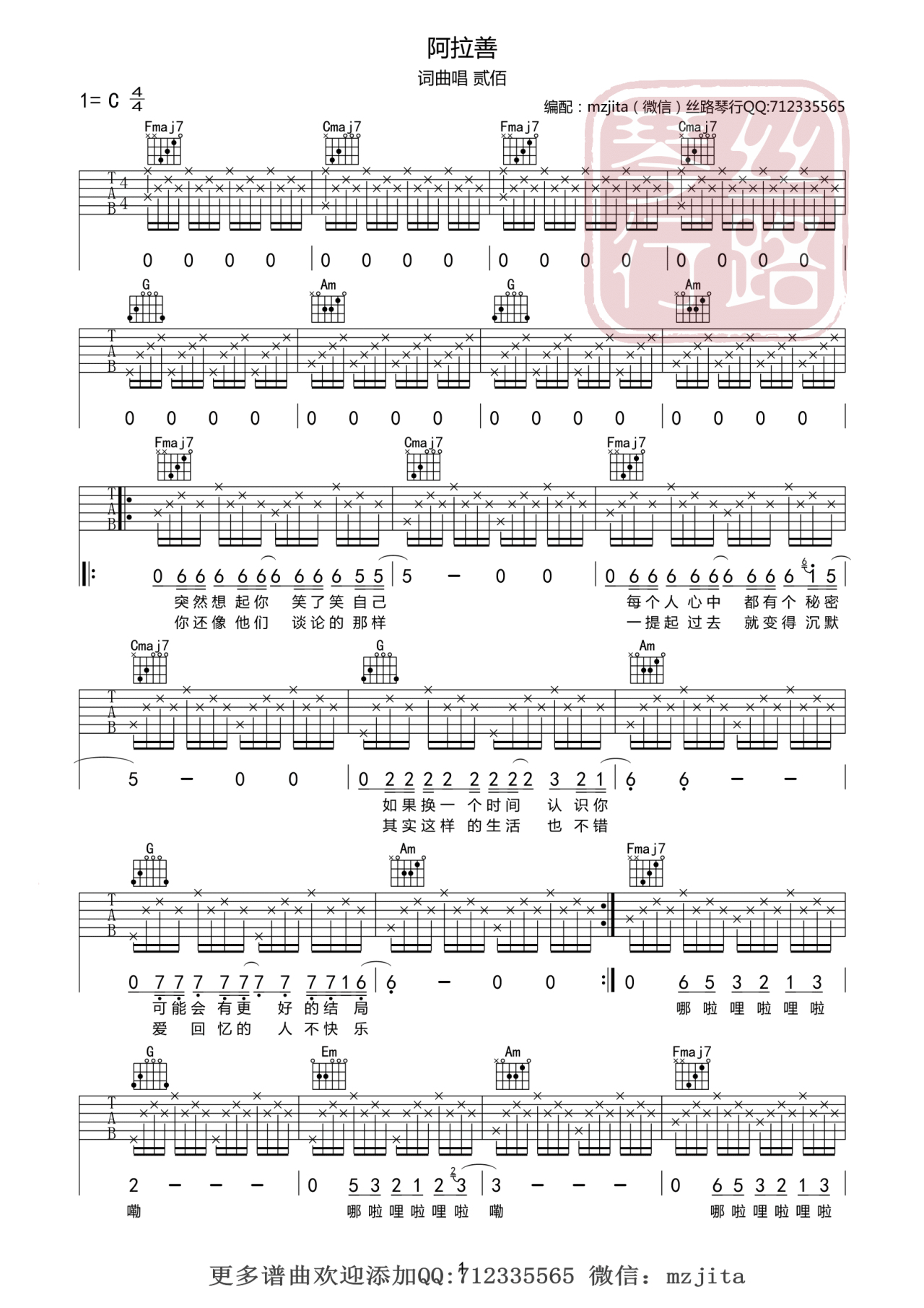 曲谱介绍: 贰佰《阿拉善》吉他弹唱谱,采用C调指法编配,丝路琴行编配出品,共有2张高清图谱,免翻页排版设计。