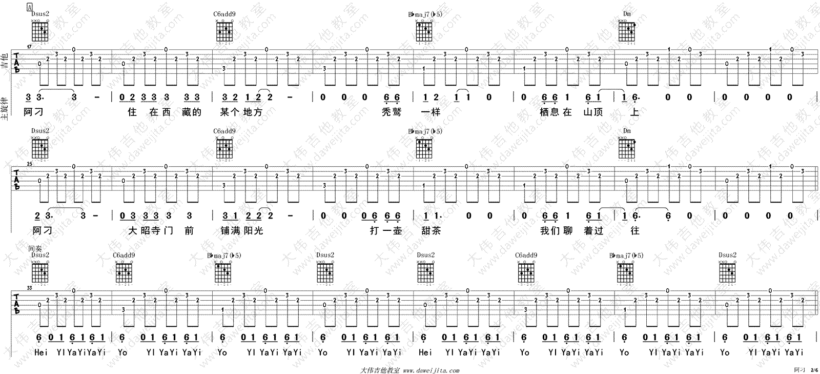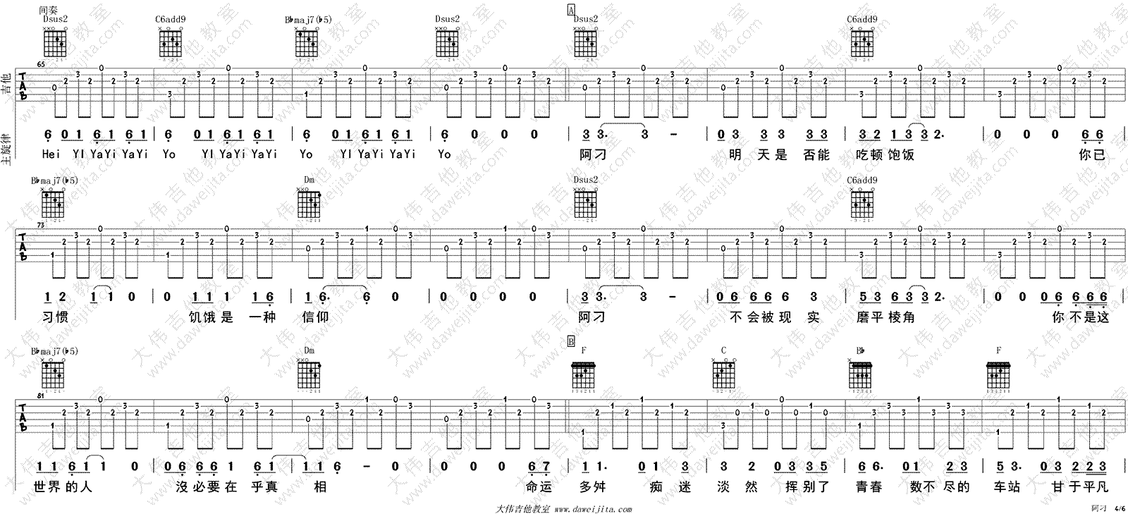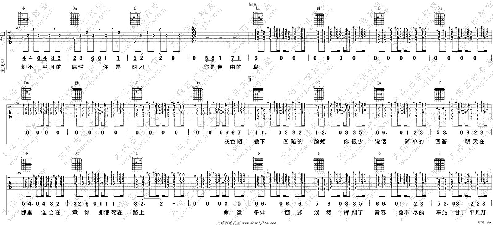 曲谱介绍: 赵雷《阿刁》吉他弹唱谱,采用F调指法编配,共有7张高清图谱。