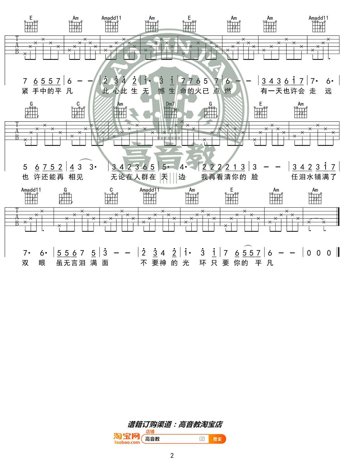 曲谱介绍: 张碧晨《只要平凡》吉他弹唱谱,采用C调指法编配,共有2张高清图谱,免翻页排版设计。