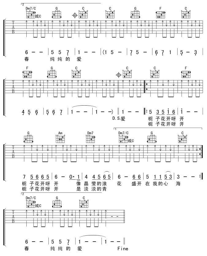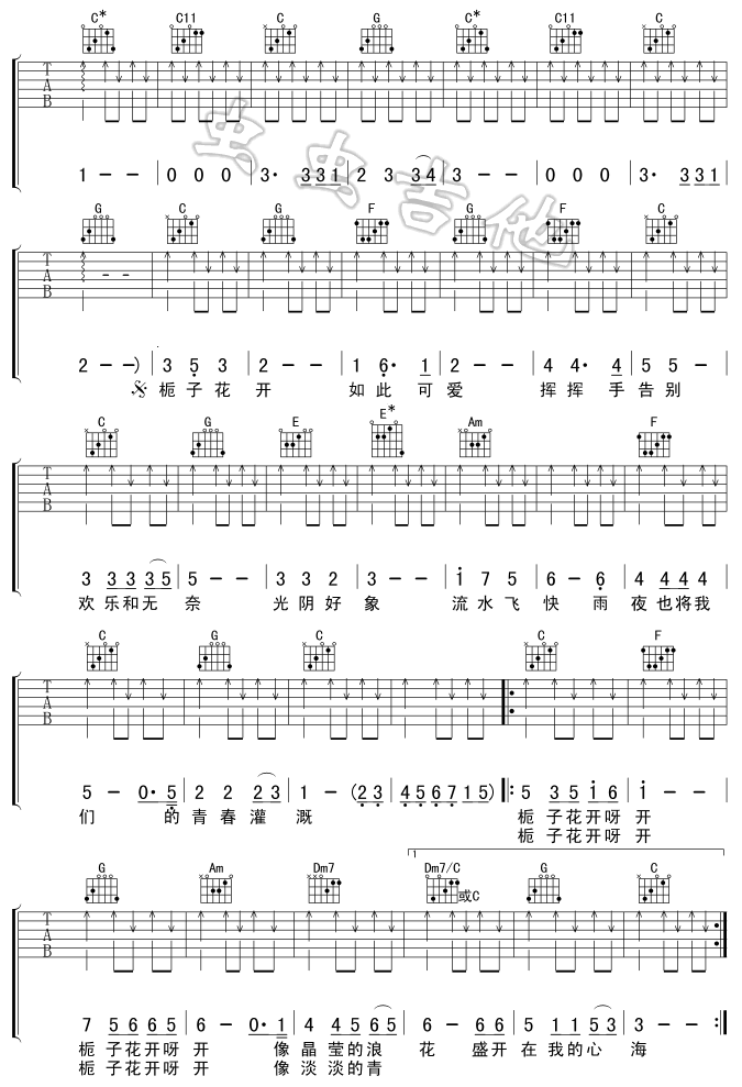 曲谱介绍: 何炅《栀子花开》吉他弹唱谱,采用C调指法编配,共有3张高清图谱。