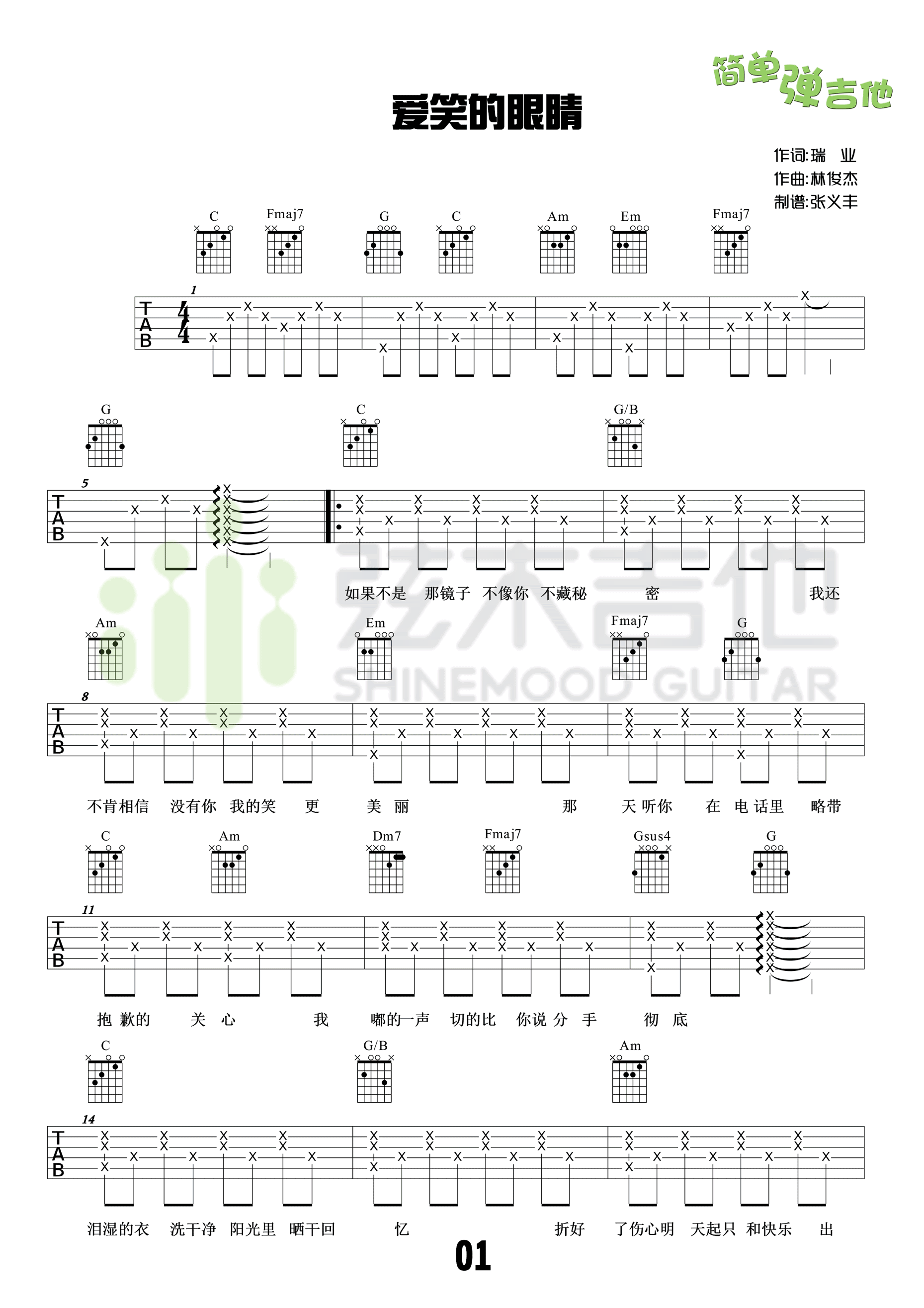 曲谱介绍: 林俊杰《爱笑的眼睛》吉他弹唱谱,采用C调指法编配,共有3张高清图谱。