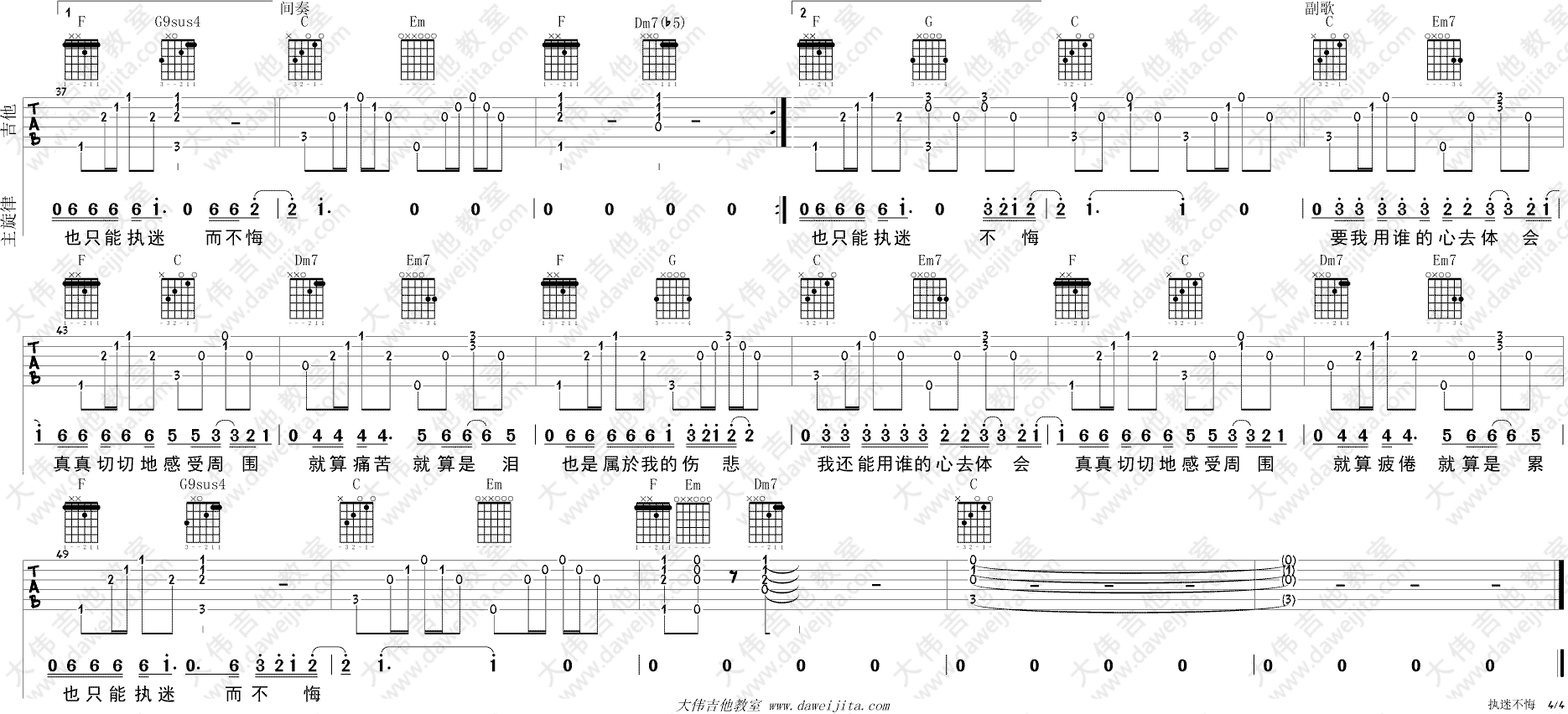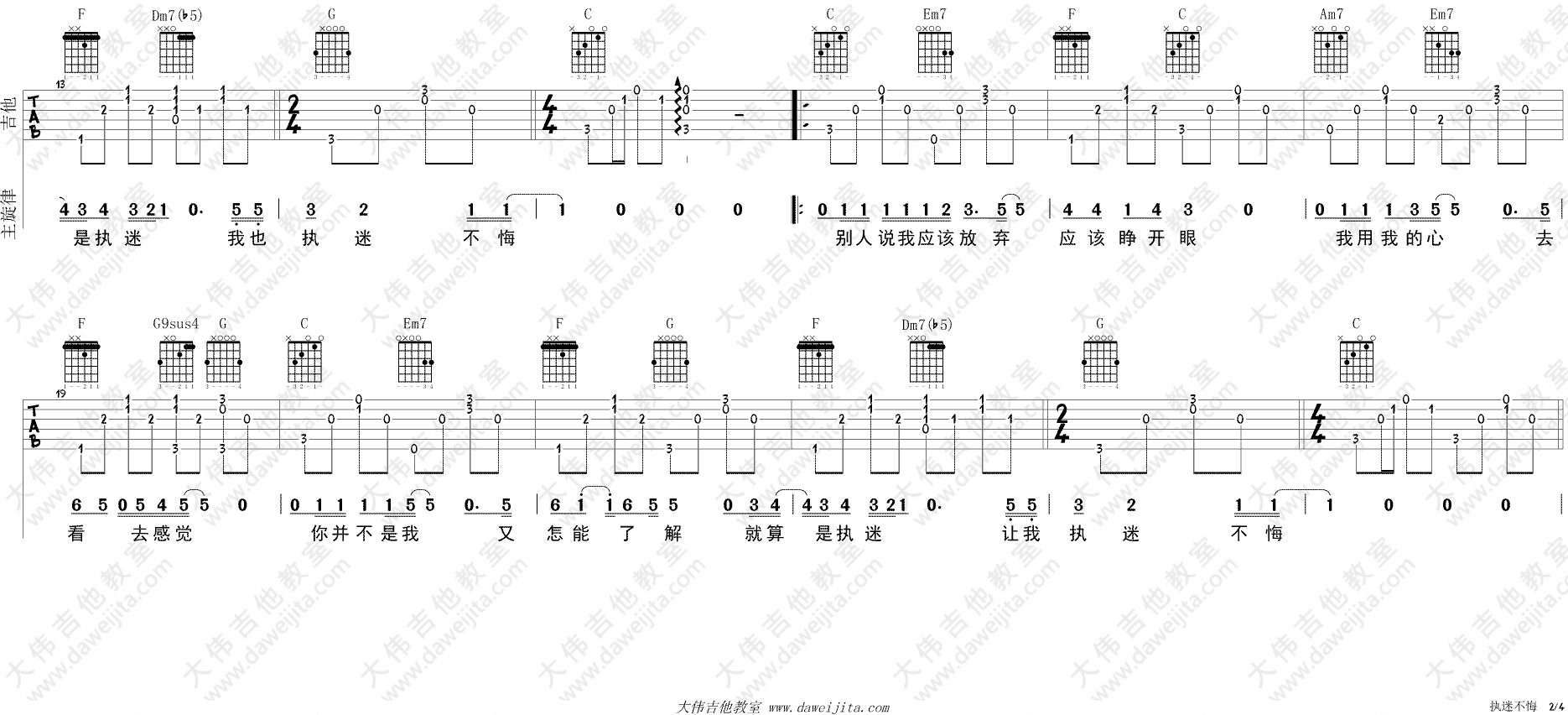 曲谱介绍: 王菲《执迷不悔》吉他弹唱谱,采用C调指法编配,大伟吉他教室编配出品,共有4张高清图谱。